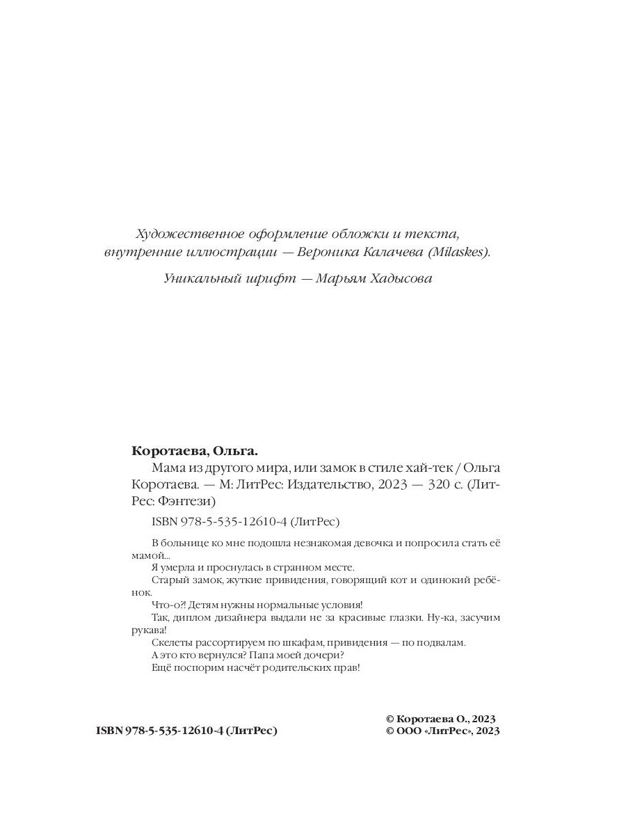 В больнице ко мне подошла незнакомая девочка и попросила стать её мамой... Я умерла и проснулась в странном месте. Старый замок, жуткие привидения, говорящий кот и одинокий ребёнок. Что-о?! Детям нужны нормальные условия! Так, диплом дизайнера выдали не за красивые глазки. Ну-ка, засучим рукава! Скелеты рассортируем по шкафам, привидения - по подвалам. А это кто вернулся? Папа моей дочери? Ещё поспорим насчёт родительских прав!| Издательство | Т8 RUGRAM |