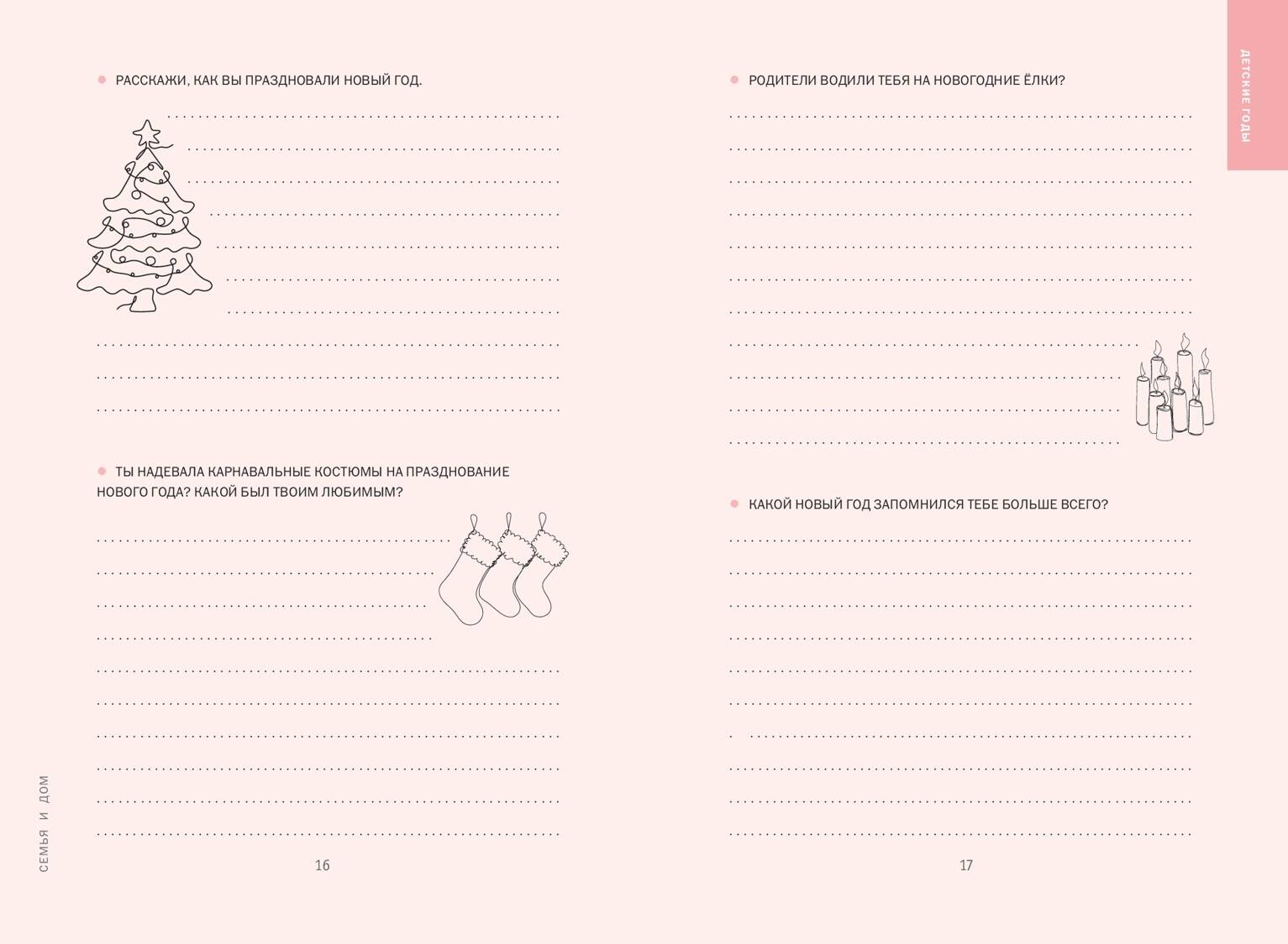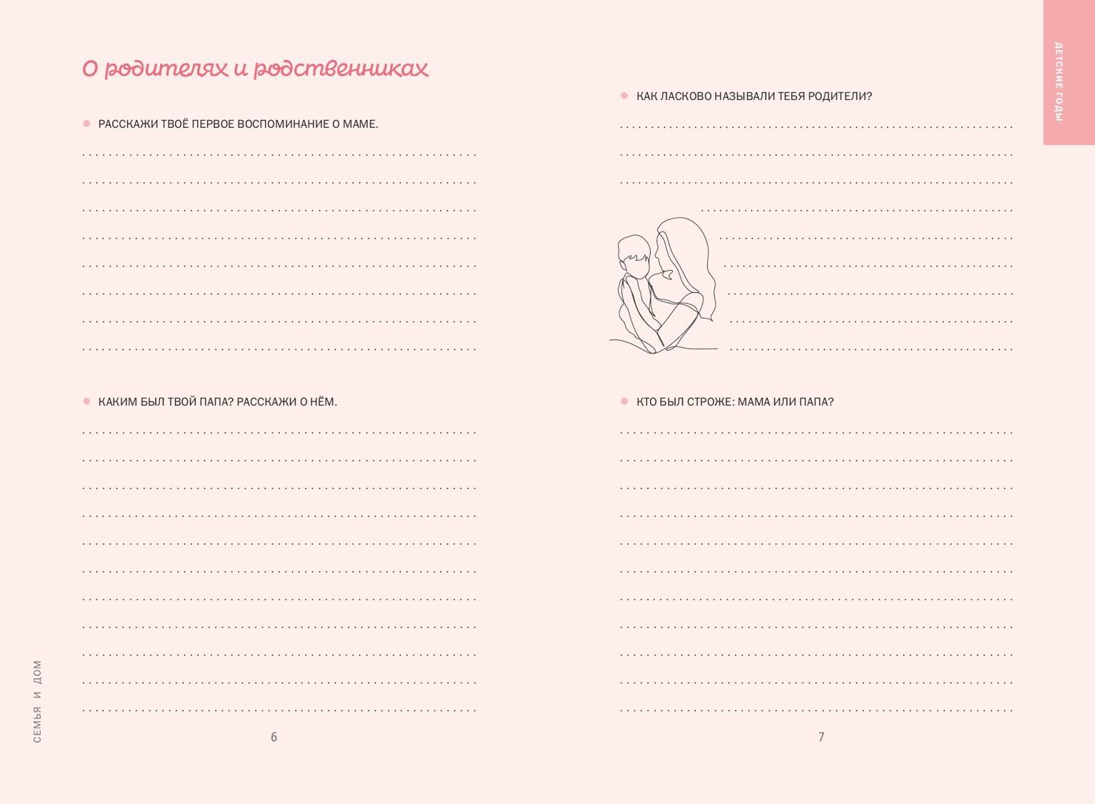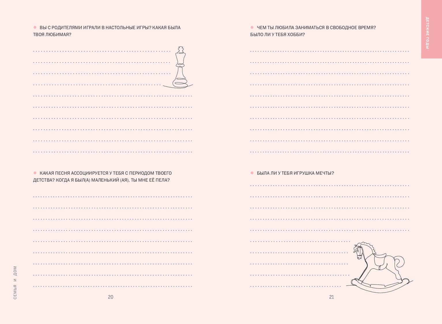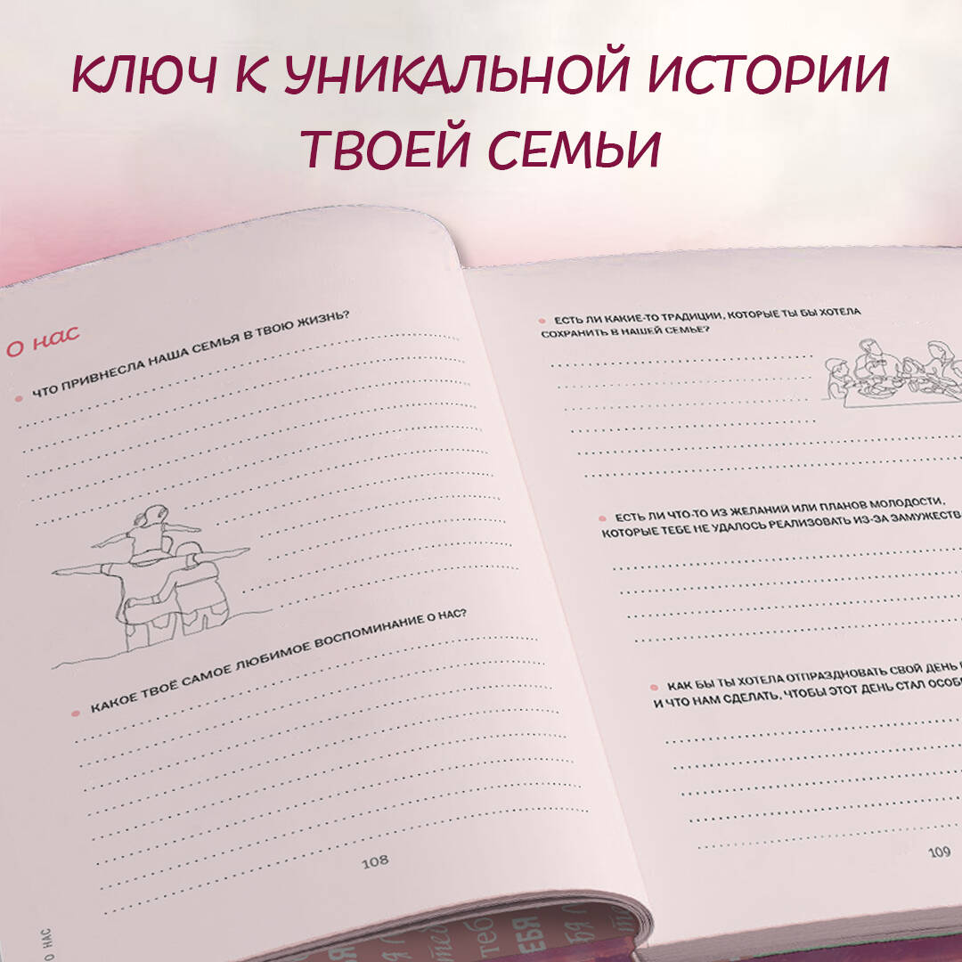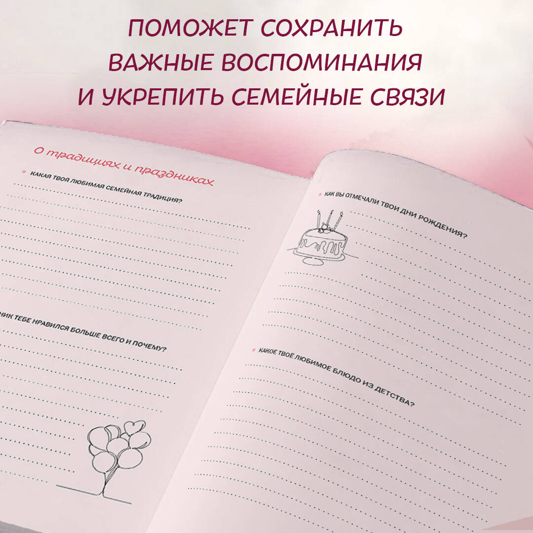 КНИГА ДЛЯ УЮТНЫХ СЕМЕЙНЫХ ВСТРЕЧ - КЛЮЧ К УНИКАЛЬНОЙ ИСТОРИИ ТВОЕЙ СЕМЬИ Наполните сердце вашей мамы радостью, сказав: «Я люблю тебя! Расскажи мне, пожалуйста, о себе!» Узнайте лучше свою маму: какой она была в детстве, о чем мечтала, чему научилась за свою жизнь и как стала такой, какая есть. Сохраните важные воспоминания и даже спустя много лет вы сможете возвращаться к книге, перечитывать и дополнять, а однажды прочитать своим детям и внукам, чтобы и они тоже узнали, каким необычным и интересным человеком была их бабушка и прабабушка. • Как в ее семье отмечали праздники, и какие традиции ей нравились больше всего? • В какие игры она играла с родителями? • Какое лето стало ее самым любимым? • Как проходили тихие часы в ее детском садике, и была ли ваша мама озорником? • Нравились ли ей полдники и обеды? • О чем она мечтала и как представляла себе мир взрослых, когда была ребенком? • Как ваша мама узнала страшную тайну о Деде Морозе? • Какой была ее школа? Какие уроки были самыми любимыми? • За что она получила свою самую позорную двойку? • Как звали маминых лучших друзей, и подшучивали ли они над учителями? • Как выглядела комната вашей мамы? • Была ли она бунтаркой в переходном возрасте? • Как проходили ее выпускные экзамены? • Какой была ее первая работа, и были ли у нее хорошие отношения с руководством? • Как мама познакомилась с вашим папой, и как он сделал ей предложение? • Что она почувствовала, когда впервые взяла вас на руки? Более 310 тем для искренних и душевных бесед с мамой! Эта книга - не просто семейный альбом или сборник вопросов. Эта книга - ваше признание в любви своей маме. Заполните ее вместе с ней или запишите ответы самостоятельно с ее слов и создайте семейное древо. Если хотите, можете задавать вопросы последовательно, ведь все они расположены хронологически - от детства к нынешнему возрасту. Но на самом деле никаких правил нет! Можете начать диалог с любого места и дальше ориентироваться на ход беседы, переходя от раздела к разделу в зависимости от приходящих воспоминаний. Пусть эта новая традиция станет шагом к узнаванию уникальной истории вашей семьи. В книге вы найдете разделы: 1. Детские годы: семья и дом, детский сад, мировоззрение 2. Школьные годы: школа, семья и дом, друзья, мировоззрение в переходном возрасте 3. Студенческие годы: учёба, отношения, мировоззрение 4. Взрослая жизнь: работа, личная жизнь, мировоззрение 5. Наша семья Кроме того, в издании есть места для фото и заметок. Книга «Мама, я тебя люблю!» - это не только идеальный подарок для близкого человека на Новый год, день рождения, 8 марта или день матери, но и ваш проводник в мир психологии и саморазвития, ведь узнавая свои корни, мы узнаем и настоящих себя, а значит, вы сможете разобраться и в вопросах к себе, которые у всех нас возникают в течение жизни. Издание подойдет и тем, кто ищет семейный фотоальбом необычного формата, и понравится вам, если вы обращали внимание на бестселлеры «С тобой я дома», «К себе нежно». Издание станет настоящим украшением книжной полки: у него отличное подарочное оформление, твердая обложка с приятным на ощупь покрытием софт тач, плотные страницы, цветная шелковая лента-закладка, съемный полусупер. Такие же книги мы сделали для папы, бабушки и дедушки - «Папа, я тебя люблю! Моя книга о тебе», «Бабушка, я тебя люблю! Моя книга о тебе», «