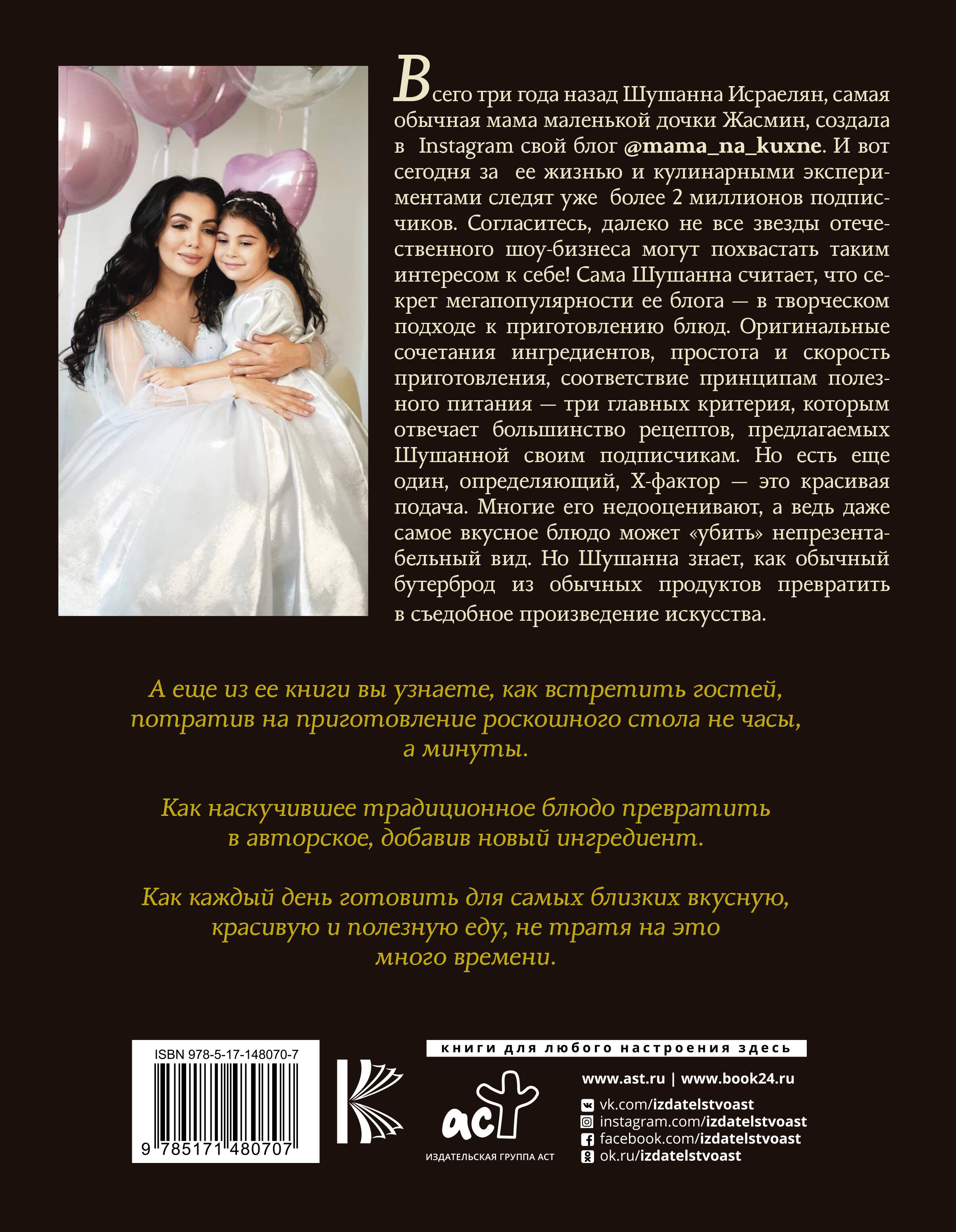 Всего три года назад Шушанна Исраелян, самая обычная мама маленькой дочки Жасмин, создала в Instagram свой блог @mama_na_kuxne. И вот сегодня за ее жизнью и кулинарными экспериментами следят уже более 2 миллионов подписчиков. Согласитесь, далеко не все звезды отечественного шоу-бизнеса могут похвастать таким интересом к себе! Сама Шушанна считает, что секрет мегапопулярности ее блога - в творческом подходе к приготовлению блюд. Оригинальные сочетания ингредиентов, легкое и быстрое приготовление, соответствие принципам полезного питания - три главных критерия, которым отвечает большинство рецептов, предлагаемых Шушанной своим подписчикам. Но есть еще один определяющий Х-фактор - это красивая подача. Многие его недооценивают, а ведь даже самое вкусное блюдо может «убить» непрезентабельный вид. Но Шушанна знает, как обычный бутерброд из обычных продуктов превратить в съедобное произведение искусства. Она поделится рецептами брускетт, закусок, салатов, горячих блюд, нарезок и бранчей и откроет секрет, как красиво подать их к столу. А еще из ее книги вы узнаете, как встретить гостей, потратив на приготовление роскошного стола не часы, а минуты. Как наскучившее традиционное блюдо превратить в авторское, добавив новый ингредиент. Как каждый день готовить для самых близких вкусную, красивую и полезную еду, не тратя на это много времени.| Издательство | АСТ |