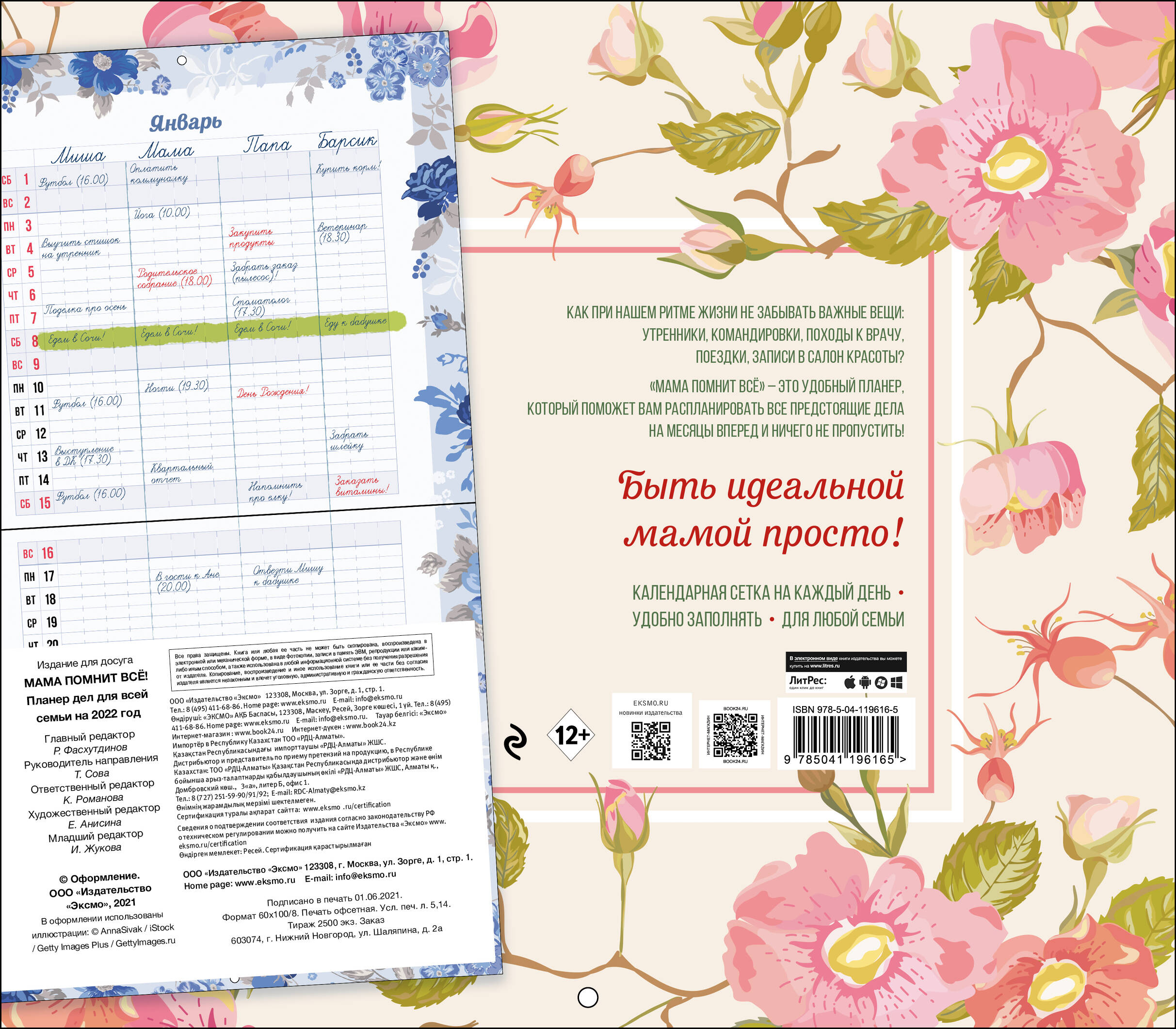 Очень важно для каждой мамы ничего не забывать в нашем бешеном ритме повседневной жизни. Планер «Мама помнит всё» станет в этом незаменимым помощником! Так как планер сделан в виде настенного календаря, он всегда будет у вас перед глазами. Каждый разворот оформлен прекрасными цветами, которые выражают настроение своего месяца и станут стильным украшением любого места в доме! Пользоваться календарем очень просто: внутри находится таблица, адаптируемая под количество членов семьи, куда вы сможете записать все предстоящие дела и события на месяцы вперед! Выходные выделены цветом. Последний разворот - январь 2023, чтобы заранее спланировать развлечения на новогодние праздники!| Издательство | Эксмо |
