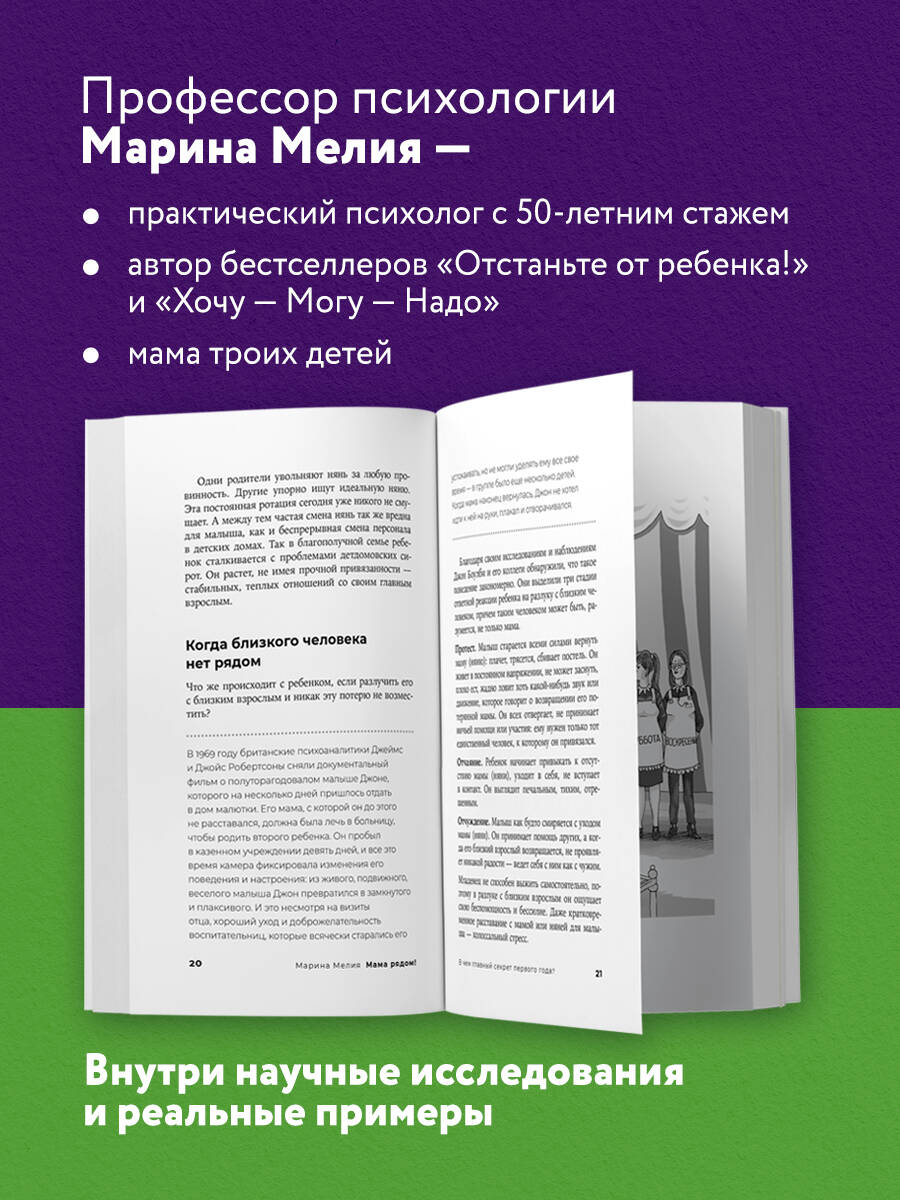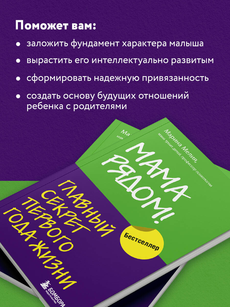ОБ АВТОРЕ Марина Мелия - мама троих детей, профессор психологии, коуч-консультант первых лиц российского бизнеса. Автор бестселлеров «Отстаньте от ребенка!», «Бизнес - это психология», «Как усилить свою силу? Коучинг», «Успех - дело личное», «Просто о сложном. Как мы живем, работаем, любим», «Наши бедные богатые дети». О КНИГЕ Многие родители уверены: в первый год жизни ребенку нужны только уход и забота. А настоящее воспитание начнется позднее. Это огромное заблуждение! Сейчас научно доказано: вырастет ли ребенок сообразительным или не очень, общительным или замкнутым, целеустремленным или безвольным - во многом зависит от того, как пройдет его первый год жизни. Роль мамы невозможно переоценить. Первые 12 месяцев она «донашивает» малыша так, словно они все еще единое целое. Ее поведение, слова, отношение, то, насколько она вкладывается в этот первый год, - влияет на будущий успех и счастье ее ребенка. Книга «Мама рядом!» поможет вам: - заложить фундамент характера малыша; - вырастить его интеллектуально развитым; - сформировать надежную привязанность; - создать основу будущих отношений ребенка с родителями; - выбрать «свою» няню.| Издательство | ООО "Издательство "Эксмо" |