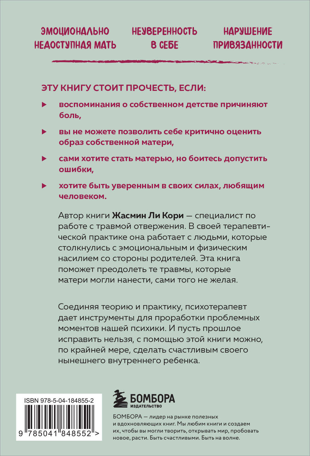 В жизни не так много переживаний, настолько же глубоких, как чувства, которые мы испытываем к нашим матерям. Корни некоторых этих чувств теряются в темных тайниках доречевого опыта. Ветви расходятся во все стороны, одни несут дивные, пропитанные солнцем моменты, а другие обломаны, с острыми и занозистыми краями, за которые мы постоянно цепляемся. Мать - не простая тема. Мы защищаем образ матери внутри себя, защищаем наши хрупкие с ней отношения путем отрицания всего, что могло бы его расшатать, и защищаем себя от разочарования, злости и боли, которые вытесняем из сознания. В своей книге психотерапевт Жасмин Ли Кори рассказывает, как исцелиться от детских психологических травм и стать уверенным в своих силах любящим взрослым. Эта книга поможет: • поменять свое отношение к детству; • увидеть все неудовлетворенные потребности внутреннего ребенка и научиться самим их удовлетворять; • увидеть взаимосвязь между пережитым опытом в детстве и трудностями в вашей жизни сейчас; • решить, какие вы хотите выстраивать отношения со своей матерью.