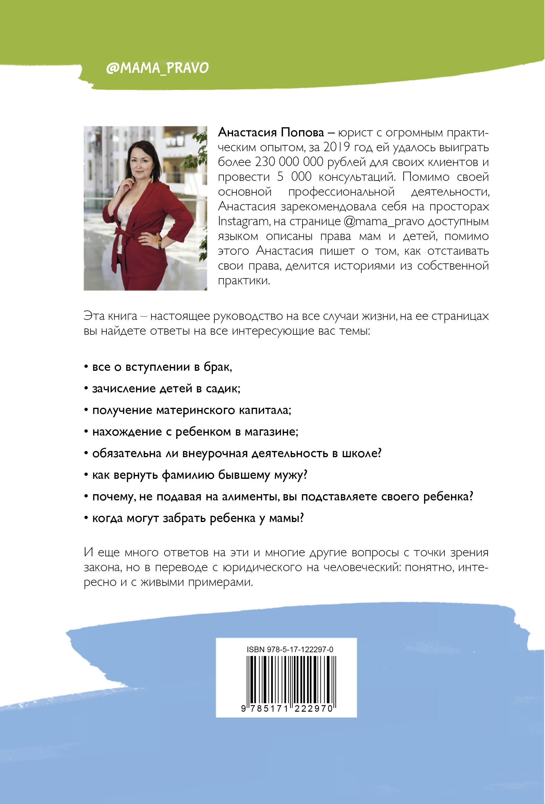 Анастасия Попова - юрист с огромным практическим опытом, за 2019 год ей удалось выиграть более 230 000 000 рублей для своих клиентов и провести 5 000 консультаций. Помимо своей основной профессиональной деятельности, Анастасия зарекомендовала себя на просторах Instagram, на странице @mama_pravo доступным языком описаны права мам и детей, помимо этого Анастасия пишет о том, как отстаивать свои права, делится историями из собственной практики. Эта книга - настоящее руководство на все случаи жизни, на ее страницах вы найдете ответы на все интересующие вас темы: • все о вступление в брак, • зачисление детей в садик; • получение материнского капитала; • нахождение с ребенком в магазине; • обязательна ли внеурочная деятельность в школе? • как вернуть фамилию бывшему мужу? • почему, не подавая на алименты, вы подставляете своего ребенка? • когда могут забрать ребенка у мамы? И еще много ответов на эти и многие другие вопросы с точки зрения закона, но в переводе с юридического на человеческий: понятно, интересно и с живыми примерами.| Издательство | ИЗДАТЕЛЬСТВО "АСТ" |
