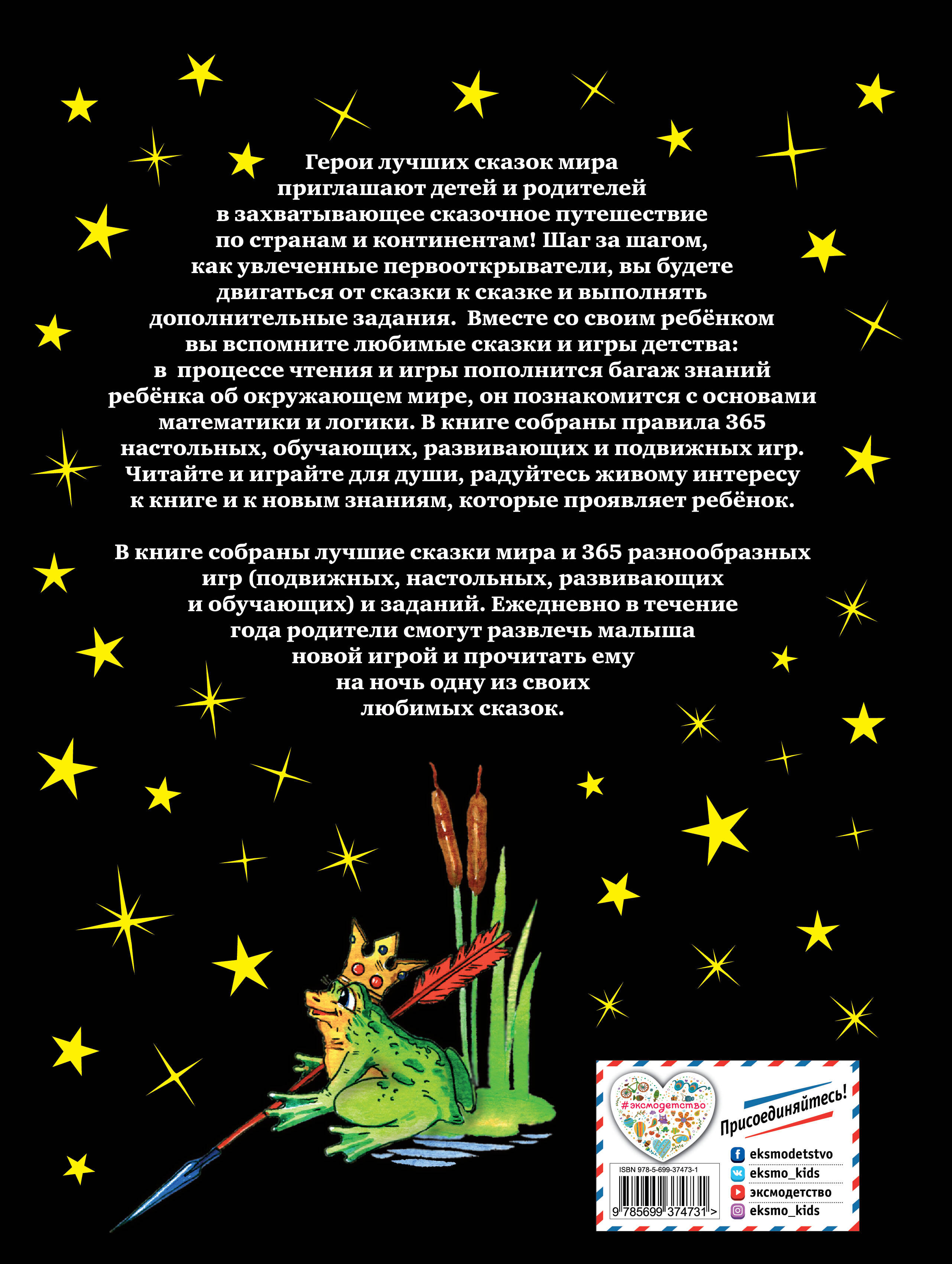 Книга содержит сказки на каждый день года и 365 увлекательных игр -;подвижных, настольных, развивающих и обучающих;. Ежедневно в течение года родители смогут развлечь малыша новой игрой и прочитать ему на ночь одну из лучших сказок мира. Для детей от 3 до 7 лет.| Издательство | Эксмо |