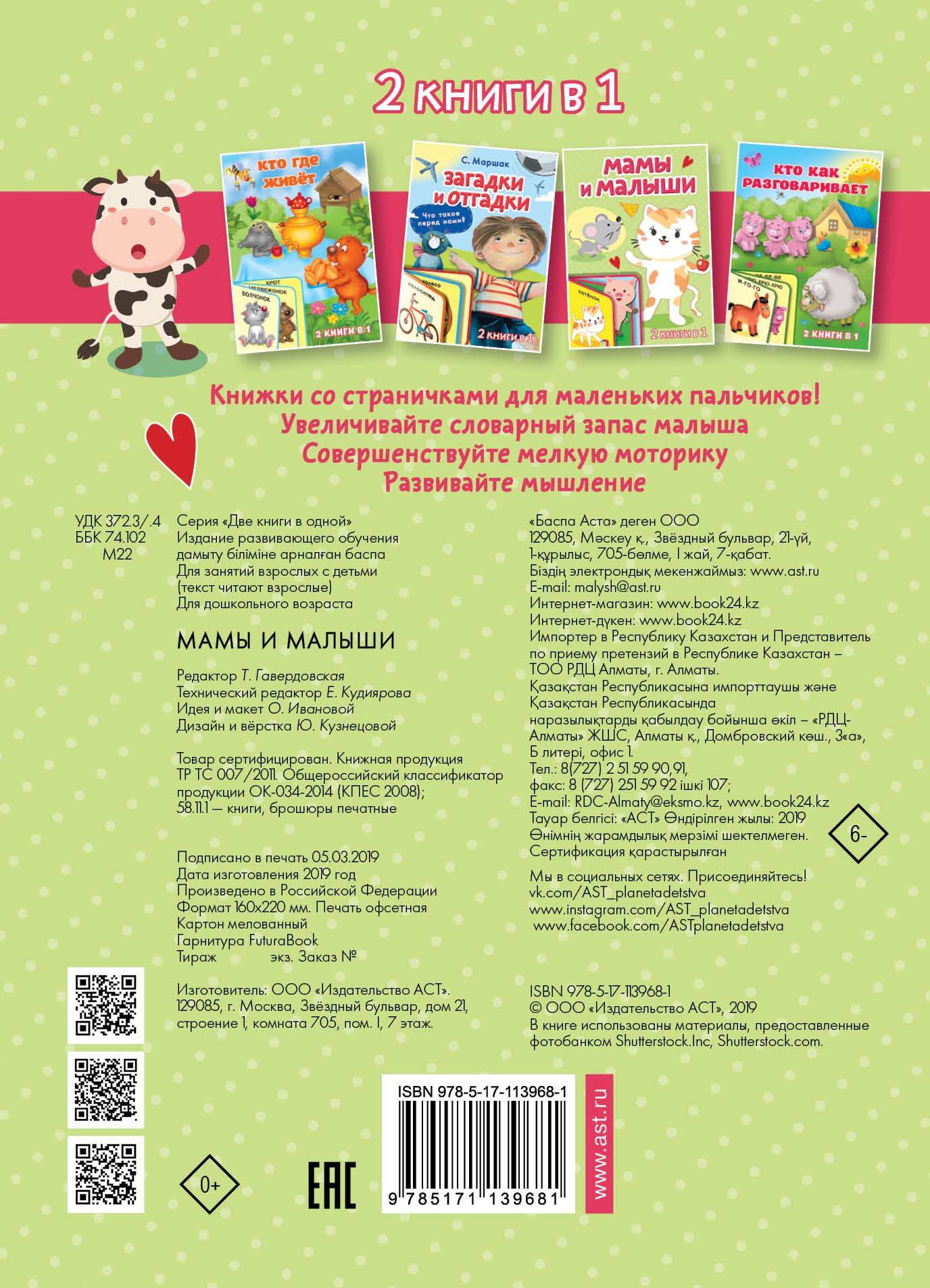 Эта двойная книжка на плотном картоне с круглёными уголками и яркими, добрыми картинками обязательно понравится вашему малышу, ведь в неё можно весело играть! Правила игры совсем не сложные: листай большие и маленькие странички, проводи пальчиком по графомоторным дорожкам, соединяй в пары мам и малышей, находи для них угощение. Зато результат такого чтения-игры превосходит все ожидания: развиваем мелкую моторику, речь, мышление и внимание. Две книги в одной - лучшая мотивация для развития вашего малыша!| Издательство | ИЗДАТЕЛЬСТВО "АСТ" |