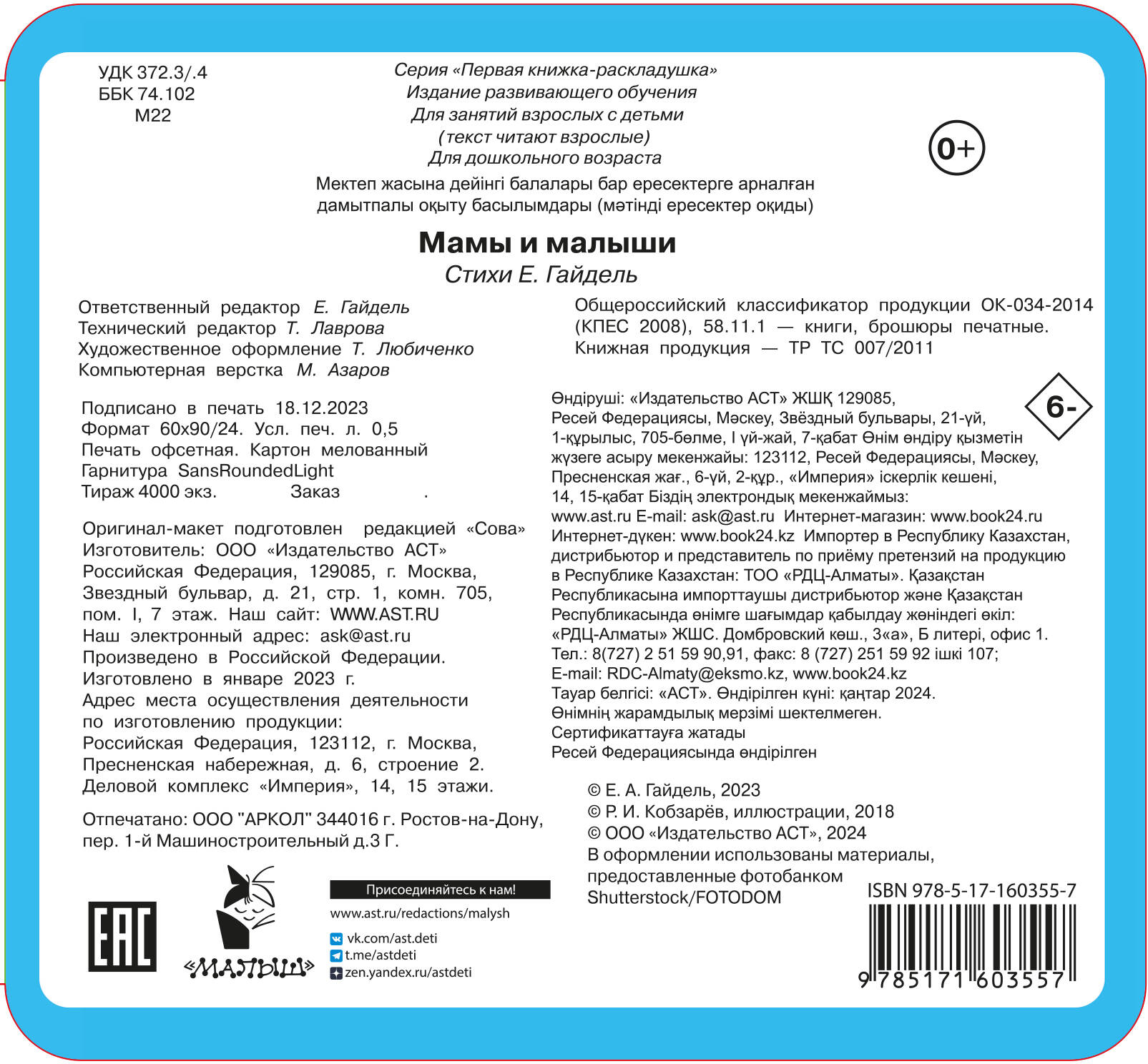 «Мамы и малыши» - весёлая книжка-гармошка для самых маленьких и любознательных ребятишек. На красочных страницах ребята найдут различных животных, их малышей и яркие картинки известной художницы Л. В. Двининой. Занятия с такими книжками развивают речь, логику, воображение, фантазию и мышление малыша. Завладеть вниманием ребёнка и превратить занятие в весёлую игру родителям поможет увлекательная серия «Первая книжка-раскладушка». Это замечательные книжки с яркими картинками для самых любознательных малышей!| Издательство | Издательство "АСТ" |