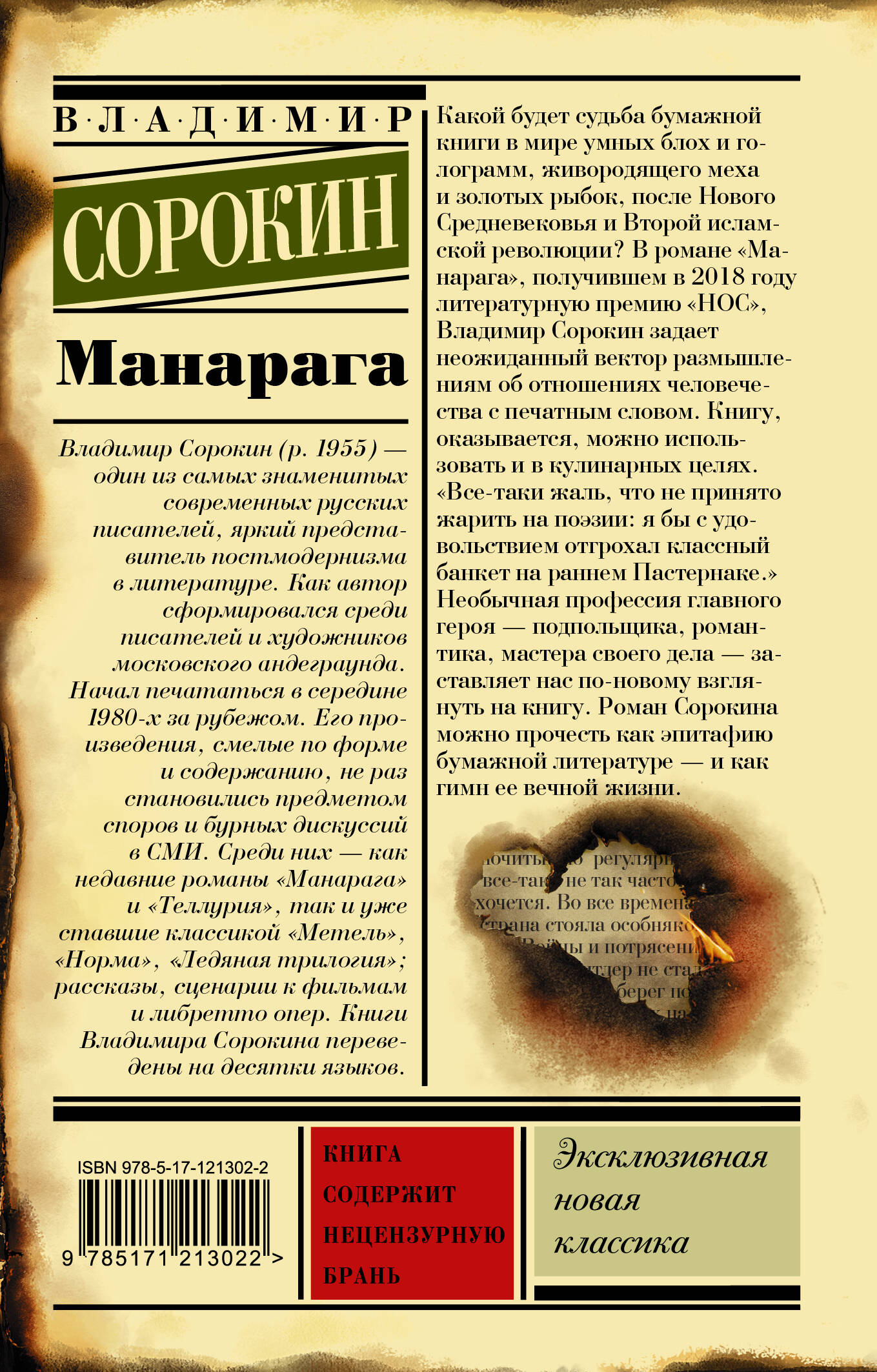 Какой будет судьба бумажной книги в мире умных блох и голограмм, живородящего меха и золотых рыбок, после Нового cредневековья и Второй исламской революции? В романе "Манарага" Владимир Сорокин задает неожиданный вектор размышлениям об отношениях человечества с печатным словом. Необычная профессия главного героя - подпольщика, романтика, мастера своего дела - заставляет нас по‑новому взглянуть на книгу. Роман Сорокина можно прочесть как эпитафию бумажной литературе - и как гимн ее вечной жизни.| Издательство | Издательство "АСТ" |