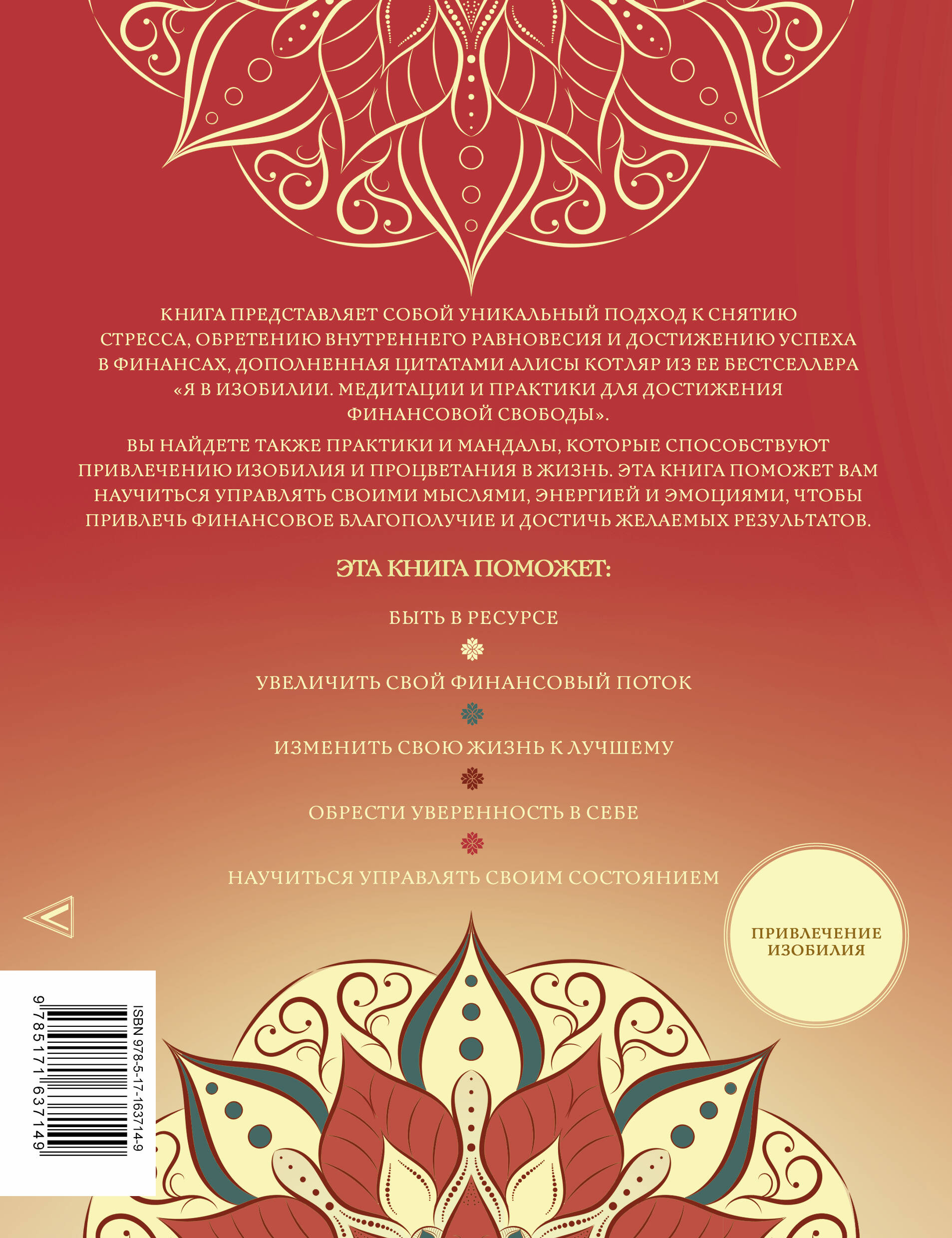 Кинга представляет собой уникальный подход к снятию стресса, обретению внутреннего равновесия и достижению успеха в финансах, дополненная цитатами Алисы Котляр из ее бестселлера "Я в изобилии. Медитации и практики для достижения финансовой свободы". Вы найдете также практики и мандалы, которые способствуют привлечению изобилия и процветания в жизнь. Эта книга поможет вам научиться управлять своими мыслями, энергией и эмоциями, чтобы привлечь финансовое благополучие и достичь желаемых результатов.| Издательство | Издательство "АСТ" |
