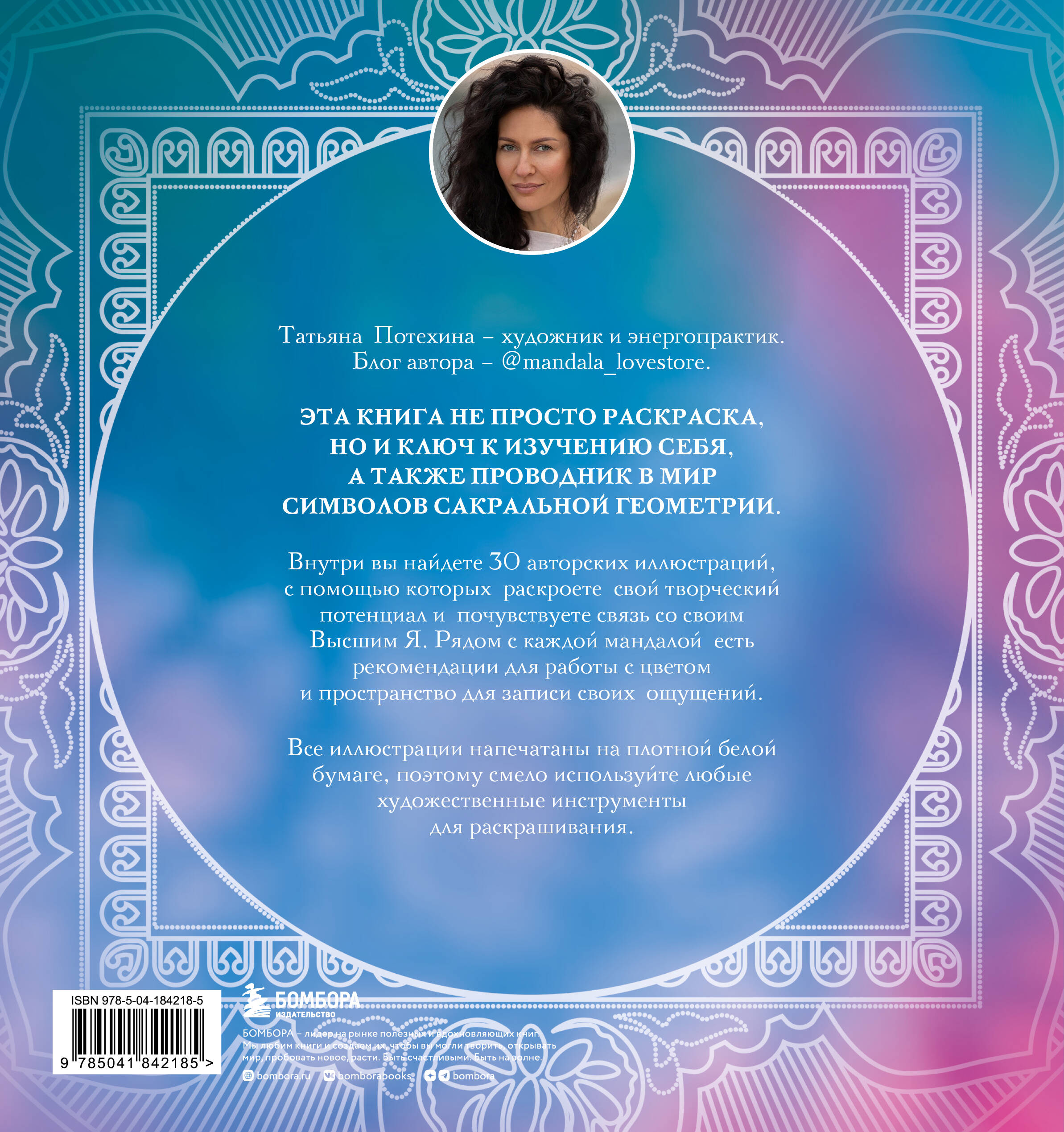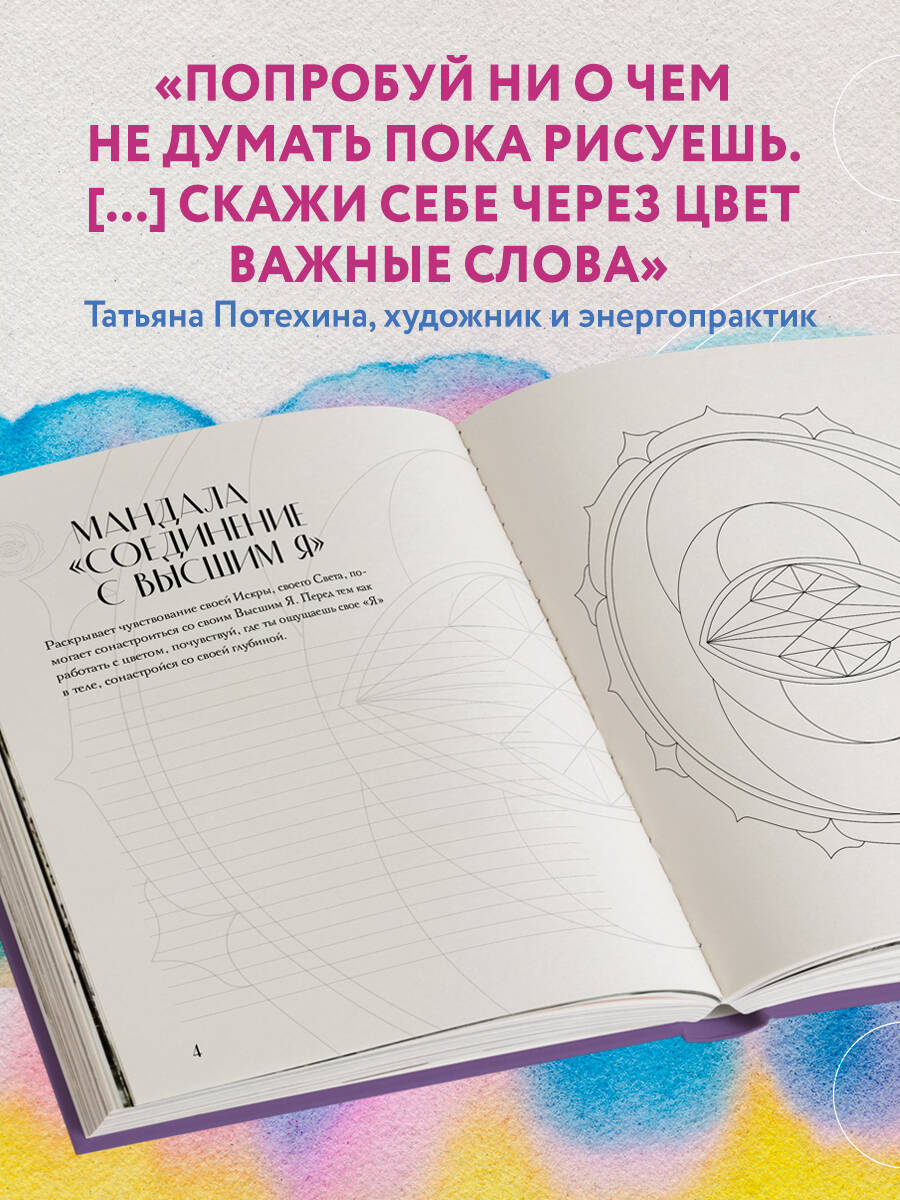Татьяна Потехина - художник и энергопрактик. Блог автора mandala_lovestore Эта книга - не просто раскраска, а ключ к изучению себя, а также проводник в мир символов Сакральной Геометрии. Внутри вы найдете 30 авторских иллюстраций, с помощью которых раскроете свой творческий потенциал и почувствуете связь со своим Высшим Я. Рядом с каждой мандалой есть рекомендации для работы с цветом и пространство для записи своих ощущений. Все иллюстрации напечатаны на плотной белой бумаге, поэтому смело используйте любые художественные инструменты для раскрашивания.| Издательство | ООО "Издательство "Эксмо" |