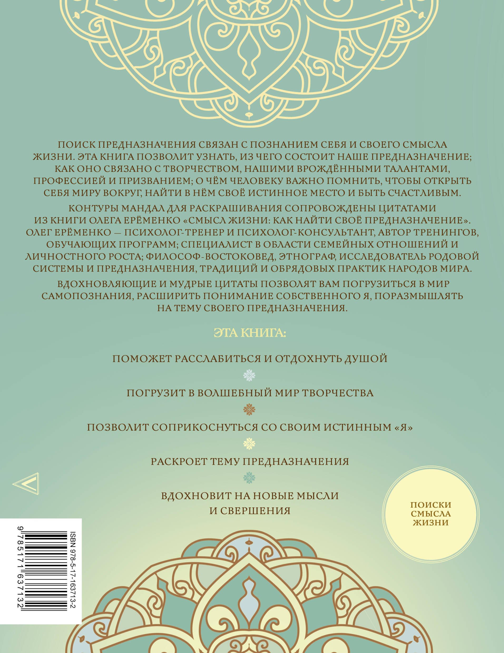 Поиск предназначения связан с познанием себя и своего смысла жизни. Эта книга позволит узнать, из чего состоит наше предназначение; как оно связано с творчеством, нашими врождёнными талантами, профессией и призванием; о чём человеку важно помнить, чтобы открыть себя миру вокруг, найти в нём своё истинное место и быть счастливым. Контуры мандал для раскрашивания сопровождены цитатами из книги Олега Ерёменко "Смысл жизни: как найти своё предназначение". Олег Ерёменко - психолог-тренер и психолог-консультант, автор тренингов, обучающих программ; специалист в области семейных отношений и личностного роста; философ-востоковед, этнограф, исследователь Родовой системы и предназначения, традиций и обрядовых практик народов мира. Вдохновляющие и мудрые цитаты позволят вам погрузиться в мир самопознания, расширить понимание собственного Я, поразмышлять на тему своего предназначения.| Издательство | Издательство "АСТ" |