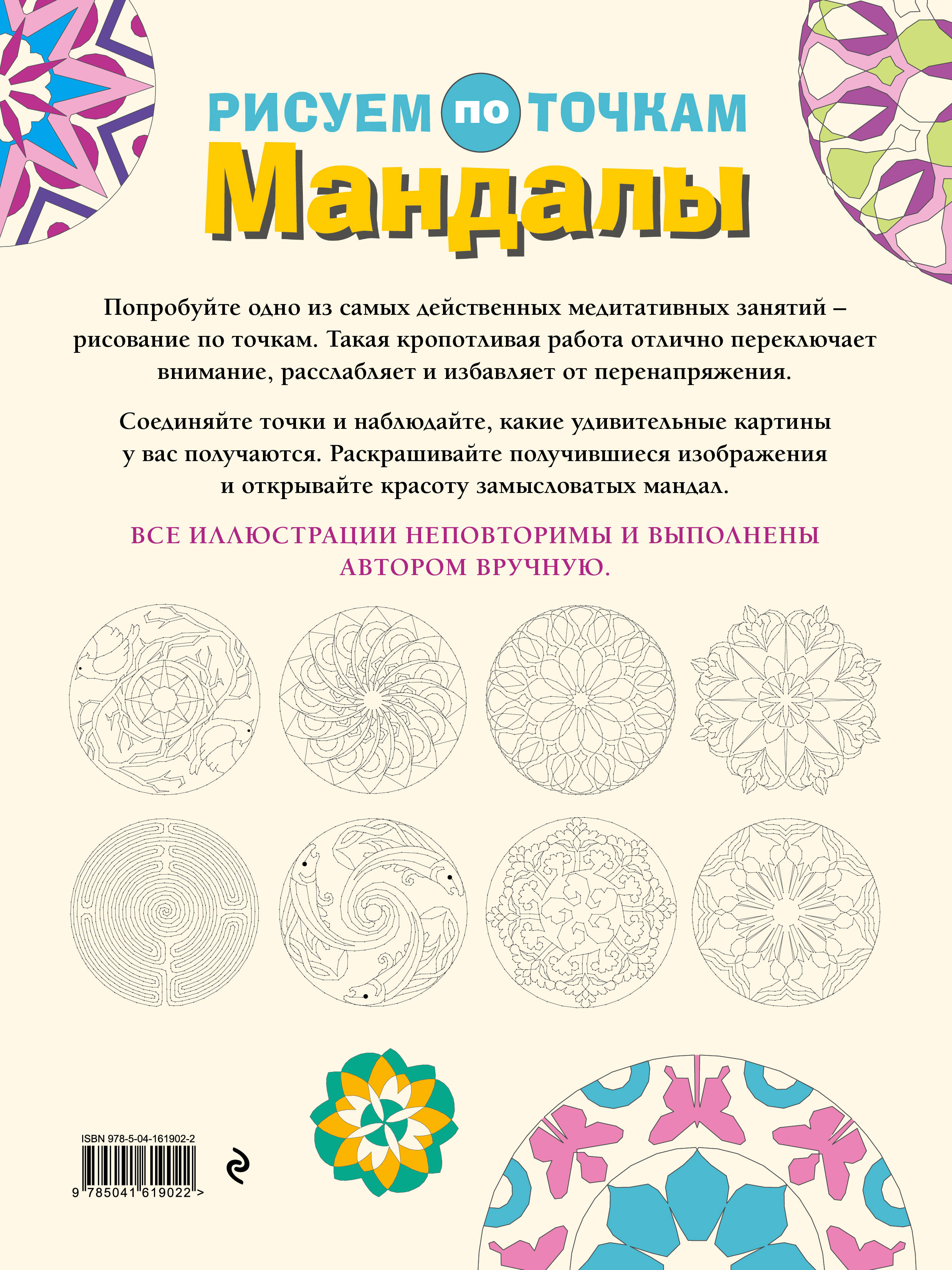 «Арт-терапия. От точки к точке» - серия великолепных авторских раскрасок, где каждая деталь продумана до мелочей! Позвольте себе отключиться на какое-то время от будничной суматохи и насладитесь головоломками разной сложности. Соединяйте точки и наблюдайте, какие потрясающие объекты у вас получаются. Когда иллюстрация будет готова, вы можете придать им цвета с помощью карандашей или фломастеров! В этой раскраске вас ждет более 40 прекрасных авторских мандал: классические, с геометрическими узорами, с растительными орнаментами и многие другие. Идеально подойдет: - для тех, кто готов поломать голову над головоломками разной сложности; - для тех, кто хотел попробовать себя в роли художника; - для любителей загадочных мандал. Совет: Используйте простой карандаш или тонкую черную ручку, чтобы соединить все точки между собой.| Издательство | Эксмо |