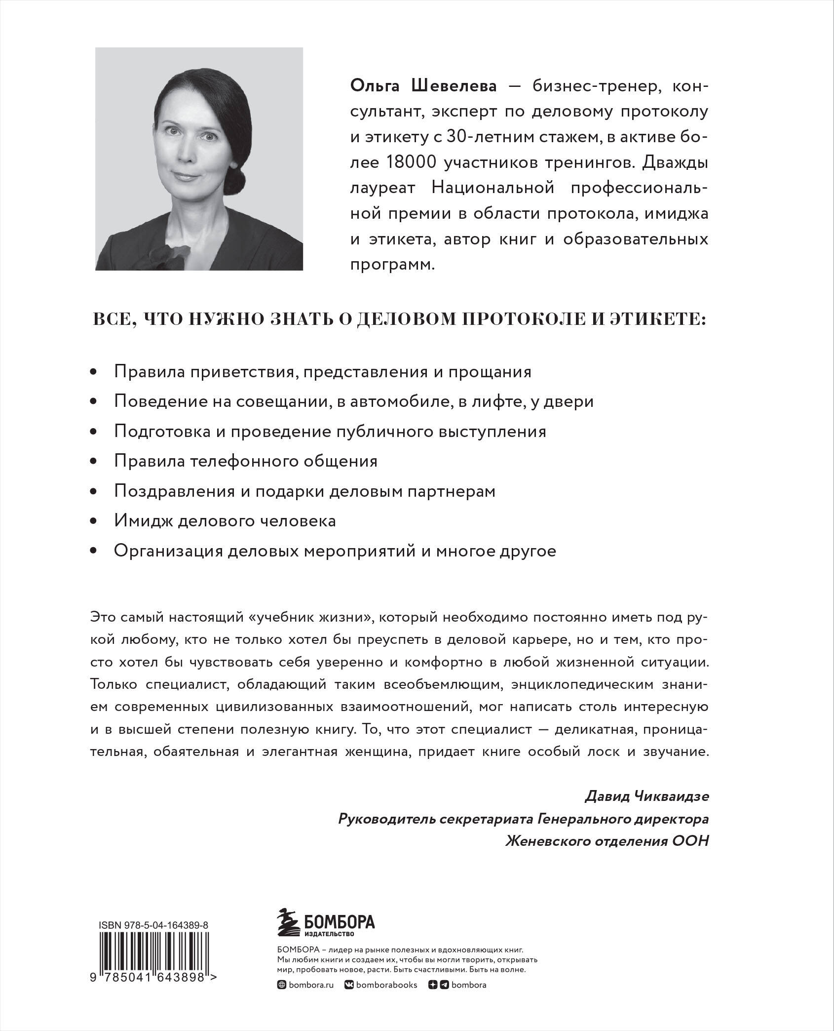 Ольга Шевелева - бизнес-тренер, консультант, эксперт по деловому протоколу и этикету с 27-летним стажем, в активе более 17 000 участников тренингов. Дважды лауреат Национальной профессиональной премии в области протокола, имиджа и этикета, автор книг и образовательных программ. Всё, что нужно знать о деловом протоколе и этикете: - Правила приветствия, представления и прощания. - Поведение на совещании, в автомобиле, в лифте, у двери. - Подготовка и проведение публичного выступления. - Правила телефонного общения. - Поздравления и подарки деловым партнерам. - Имидж делового человека. - Организация деловых мероприятий и многое другое. «Это самый настоящий "учебник жизни", который необходимо постоянно иметь под рукой любому, кто не только хотел бы преуспеть в деловой карьере, но и тем, кто просто хотел бы чувствовать себя уверенно и комфортно в любой жизненной ситуации. Только специалист, обладающий таким всеобъемлющим, энциклопедическим знанием современных цивилизованных взаимоотношений, мог написать столь интересную и в высшей степени полезную книгу. То, что этот специалист - деликатная, проницательная, обаятельная и элегантная женщина, придает книге особый лоск и звучание». - Давид Чикваидзе, Руководитель секретариата Генерального директора Женевского отделения ООН| Издательство | Эксмо |