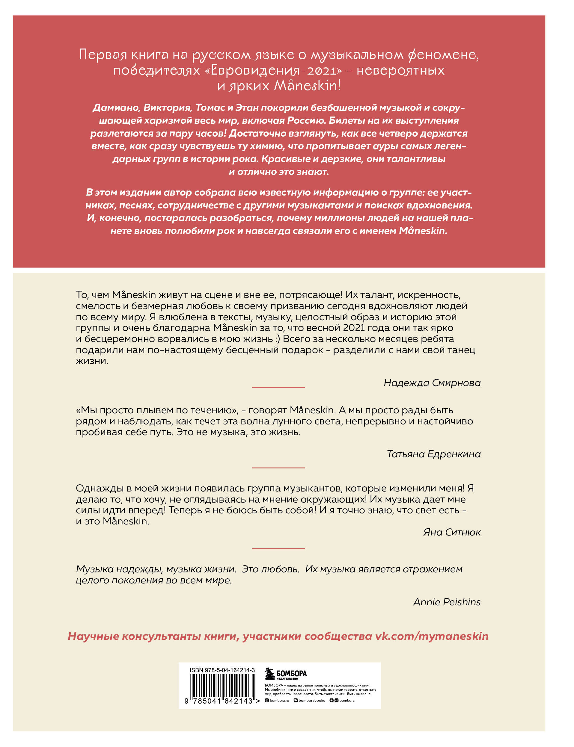 Первая биография Maneskin на русском языке! Дамиано, Виктория, Томас и Этан за четыре года превратились из уличной группы в звезд мировой величины. Они заслужили уважение таких рок-легенд, как Мик Джаггер и Игги Поп, выиграли «Евровидение», а билеты на их концерты раскупаются за пару часов. Журналистка Rolling Stone Гийя Кортасса рассказывает о том, как проходили первые выступления группы, вспоминает их участие в X Factor и Сан-Ремо и подводит читателей к вершине славы молодых триумфаторов: выступлению на стадионе Allegiant в Лас-Вегасе и, разумеется, первому месту на «Евровидении-2021». Также вы узнаете истории создания и записи уже полюбившихся фанатам песен и каверов, в том числе Zitti e buoni и I wanna be your slave. Иллюстрации для книги нарисовала Сара Ротлик. Ее стиль представляет собой оригинальное переплетение различных культур со стилистическими отсылками к манге и к западной поп-культуре. Книга подготовлена при участии и информационной поддержке российского фан-комьюнити группы vk.com/mymaneskin.| Издательство | Эксмо |