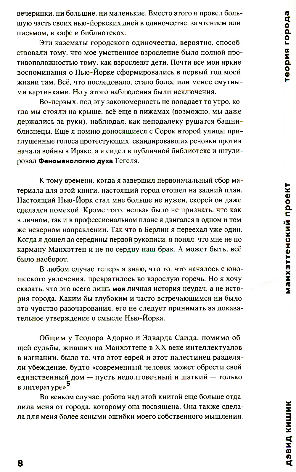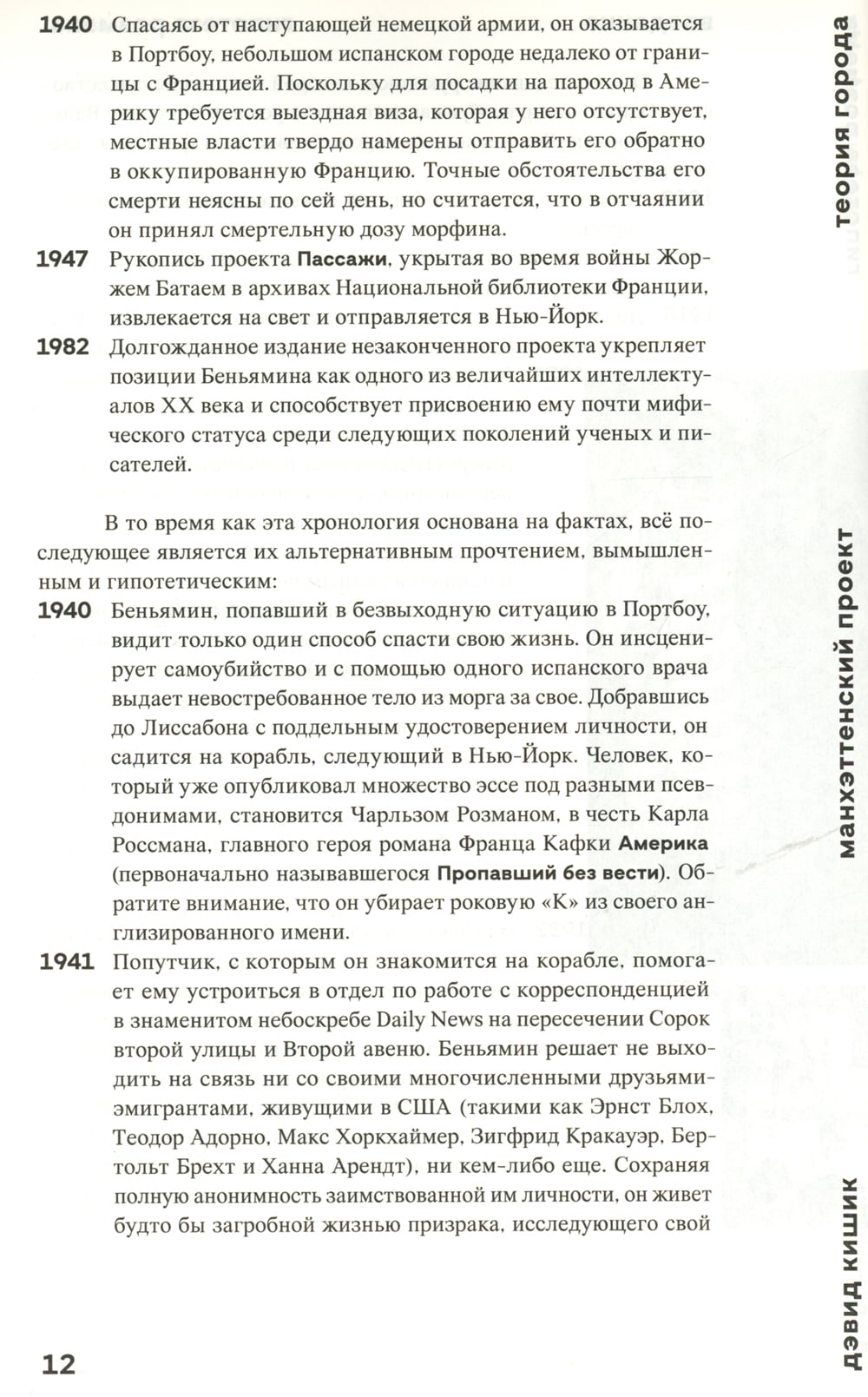 Дэвид Кишик - профессор бостонского Эмерсон-колледжа, известный среди прочего опытами fictional philosophy, отправной точкой которых служит «альтернативный факт», то, что могло бы случиться, если… В книге "Манхэттенский проект. Теория города" таким «фактом» становится успешное бегство Вальтера Беньямина в США, где его знаменитый проект Пассажи, посвященный Парижу - столице XIX века, получает продолжение на материале Нью-Йорка 1940-1980-х годов. Сквозь чувствительную беньяминовскую оптику мы наблюдаем, как бетонные улицы и небоскребы, граффити и пригородные мечты, люди-бутерброды и бездомные, «гении места» - Вуди Аллен, Роберт Мозес, Энди Уорхол, Рем Колхас, Ханна Арендт, Джейн Джекобс, Джозеф Гулд… - складываются в ментальную карту столицы ХХ века, Нью-Йорка. С помощью трех осей - реальность/фантазия, политика/экономика, рай/ад, - на которых найдется место любым элементам большого города, Кишик сочиняет свою нью-йоркскую «фикшн»-философию и подбирает метафоры современности второй трети ХХ века, нащупывая в «хаотичном и фрагментарном урбанистическом хеппенинге» манифест урбанистической революции.