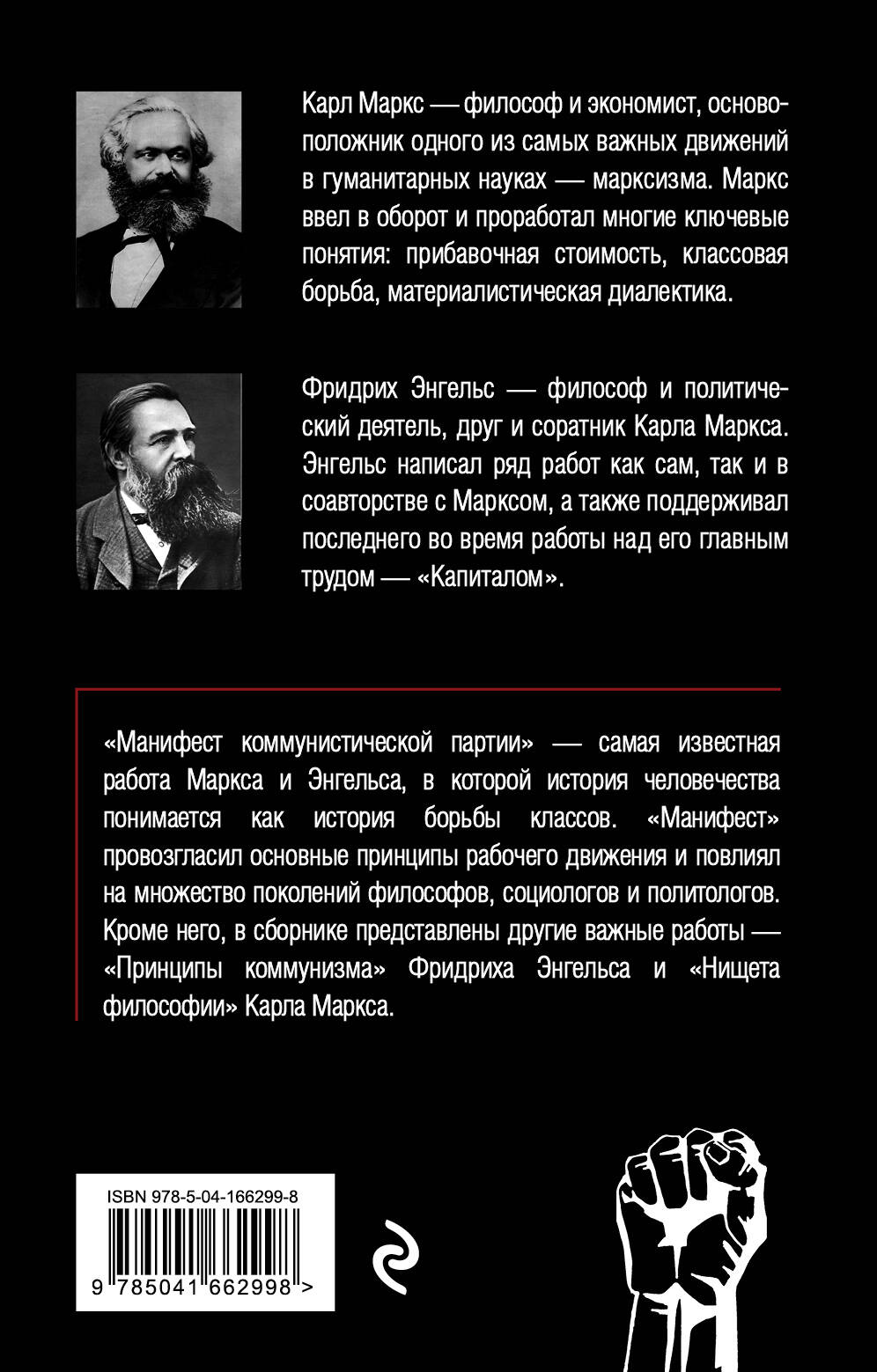 «Манифест коммунистической партии» - самая известная работа Маркса и Энгельса, в которой история человечества понимается как история борьбы классов. "Манифест" провозгласил основные принципы рабочего движения и повлиял на множество поколений философов, социологов и политологов.| Издательство | Эксмо |