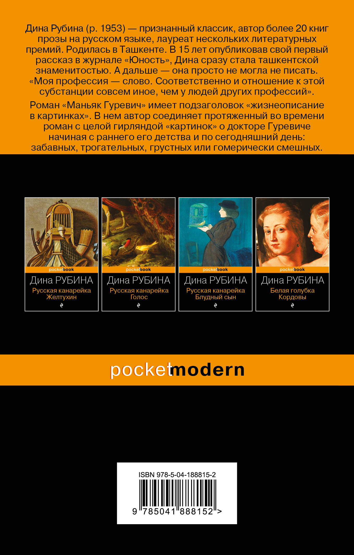 КНИГУ ДИНЫ РУБИНОЙ «МАНЬЯК ГУРЕВИЧ» НУЖНО ЧИТАТЬ, ПОТОМУ ЧТО: 1. ЭТО НОВЫЙ - ЯРКИЙ, ДОБРЫЙ, ЛЕГКИЙ - РОМАН АВТОРА, 2. В ЦЕНТРЕ - ВРАЧ, СПЕЦИАЛИСТ ПО ПСИХИАТРИИ, В ЖИЗНИ И МЕДИЦИНСКОЙ ПРАКТИКЕ КОТОРОГО - МНОЖЕСТВО ВЕСЕЛЫХ И ДРАМАТИЧЕСКИХ, ТРОГАТЕЛЬНЫХ И НЕЛЕПЫХ, ГРУСТНЫХ И ГОМЕРИЧЕСКИ СМЕШНЫХ ИСТОРИЙ. 3. ЭТО ЖИЗНЕОПИСАНИЕ В КАРТИНКАХ, СЮЖЕТЫ И КОЛОРИТ КОТОРЫХ ВО МНОГОМ НАПОМИНАЮТ НАМ СОБСТВЕННУЮ ЖИЗНЬ. 4. ГЛАВНАЯ ИНТОНАЦИЯ РОМАНА - ИРОНИЯ И ПАРАДОКС, КОТОРЫХ ТАК НЕ ХВАТАЕТ В НАШЕ СУМРАЧНОЕ КОВИДНОЕ ВРЕМЯ. 5. ВЫСОКАЯ ТЕМПЕРАТУРА ЭМОЦИЙ ГАРАНТИРОВАНА.| Издательство | ООО "Издательство "Эксмо" |