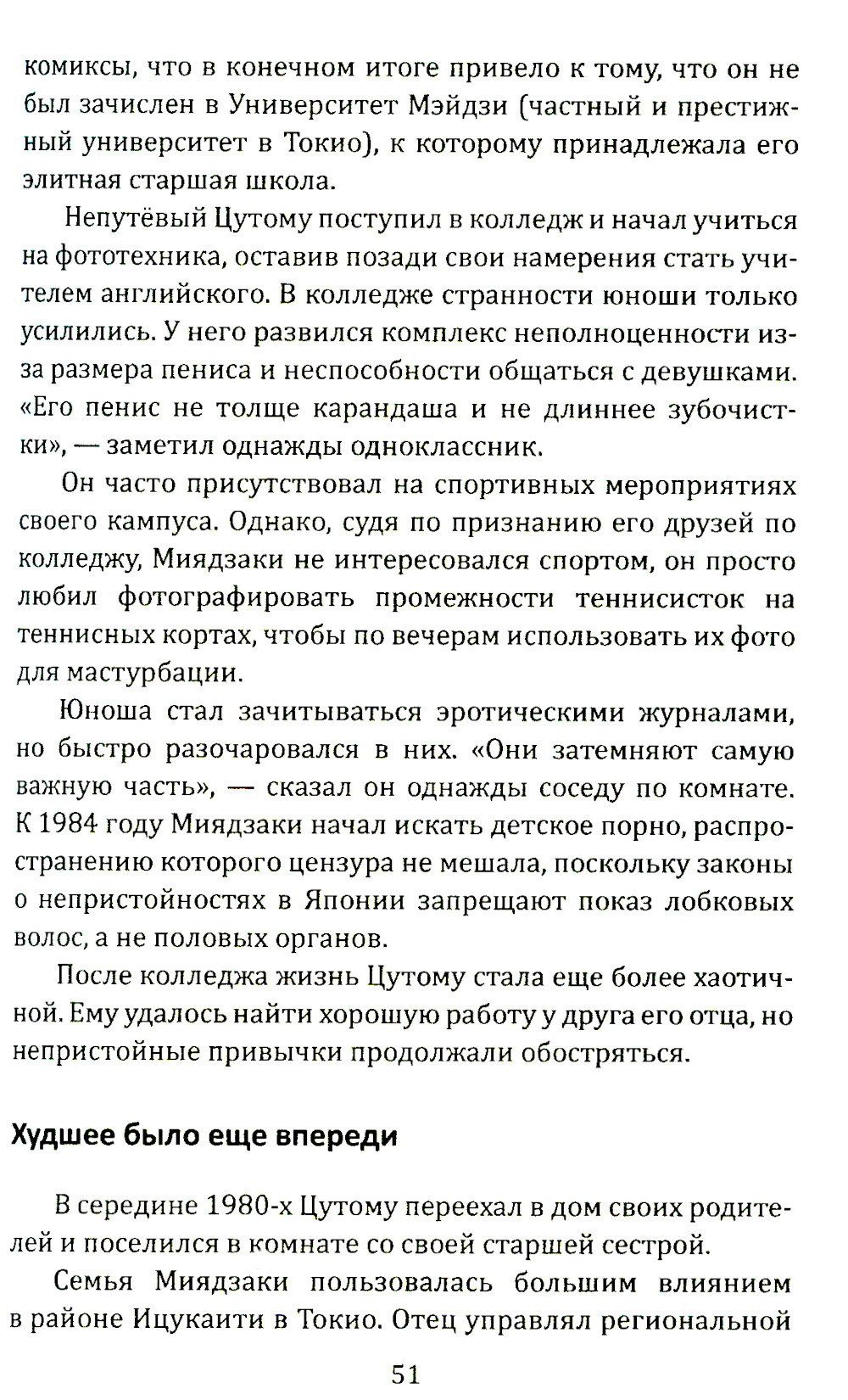 Япония. Загадочная и древняя цивилизация. Глубокая созерцательность здесь сочетается с лихой удалью, тонкая этика - с сексуальной раскрепощённостью, а строгое следование общественным нормам - с индивидуализмом и даже ницшеанством. Естественно, в японском обществе, где человек зажат в рамки патриархальной семьи и корпоративной культуры, возникли сложные общественные проблемы. Эти недуги подчас приобретают самый жуткий и гротескный характер, вырываются на поверхность: выползают из темных подворотен бескрайних токийских трущоб, из заброшенных колодцев, из крохотных замусоренных каморок... Будьте готовы окунуться в настоящую пучину безысходности, тлена, деградации и морального разложения. Здесь погибают все добрые человеческие чувства. Здесь наступает граница между человеком и демоном. Эта книга откроет вам пугающий мир боли и страданий.| Издательство | Родина |