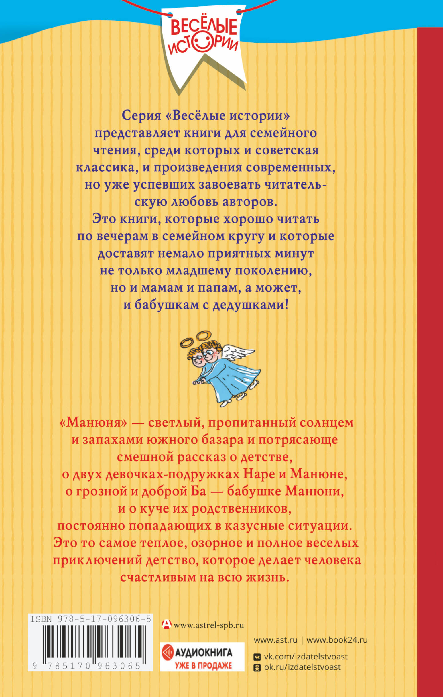 "Манюня" - светлый, пропитанный солнцем и запахами южного базара и потрясающе смешной рассказ о детстве, о двух девочках-подружках Наре и Манюне, о грозной и доброй Ба - бабушке Манюни, и о куче их родственников, постоянно попадающих в казусные ситуации. Это то самое теплое, озорное и полное веселых приключений детство, которое делает человека счастливым на всю жизнь. Книга - лауреат премии "Рукопись года"
