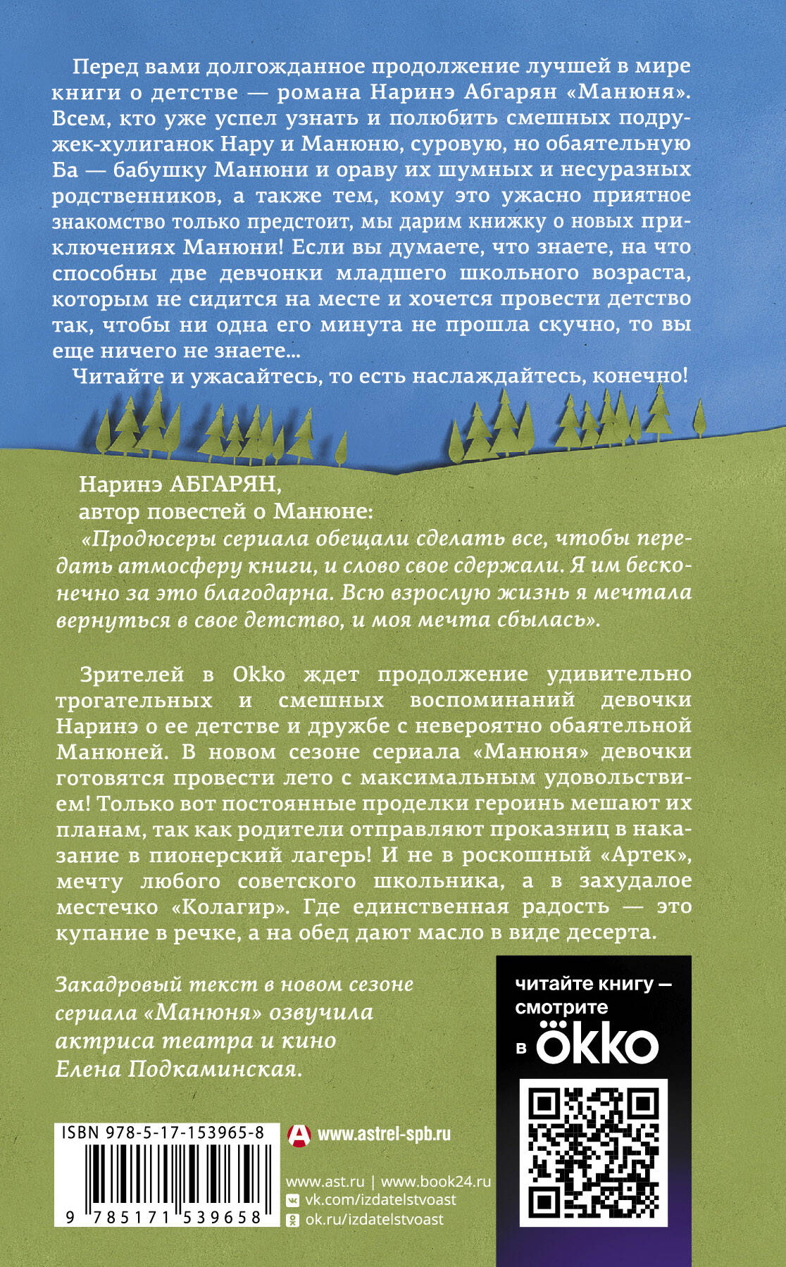 Вторая часть популярной трилогии о приключениях жизнерадостной непоседы Манюни и ее закадычной подруги Наринэ! В книге по традиции содержатся красочные иллюстрации Елены Станиковой, а также цветные вклейки с кадрами из фильма: этой зимой на сервисе OKKO состоялась премьера второго сезона экранизации «Манюни»!| Издательство | ИЗДАТЕЛЬСТВО "АСТ" |