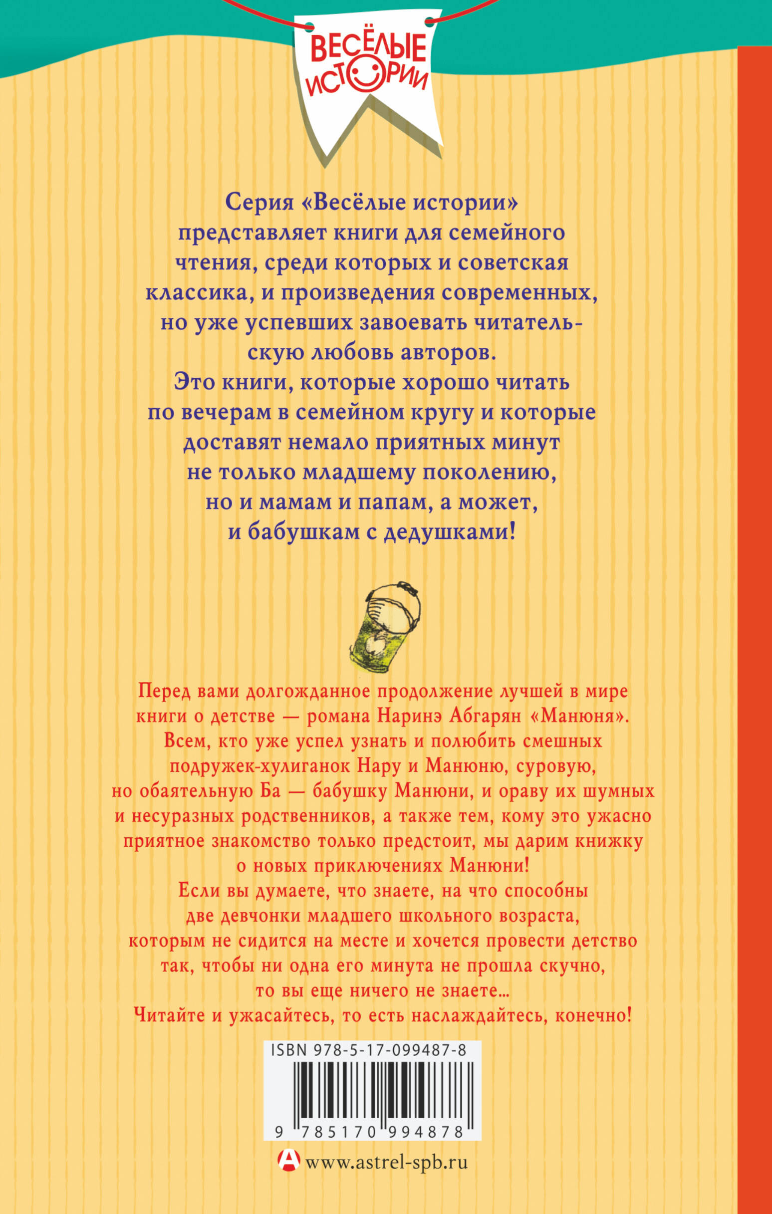 Перед вами долгожданное продолжение лучшей в мире книги о детстве - романа Наринэ Абгарян "Манюня". Всем, кто уже успел узнать и полюбить смешных подружек-хулиганок Нару и Манюню, суровую, но обаятельную Ба - бабушку Манюни и ораву их шумных и несуразных родственников, а также тем, кому это ужасно приятное знакомство только предстоит, мы дарим книжку о новых приключениях Манюни! Если вы думаете, что знаете, на что способны две девчонки младшего школьного возраста, которым не сидится на месте и хочется провести детство так, чтобы ни одна его минута не прошла скучно, то вы еще ничего не знаете... Читайте и ужасайтесь, то есть наслаждайтесь, конечно!| Издательство | ИЗДАТЕЛЬСТВО "АСТ" |