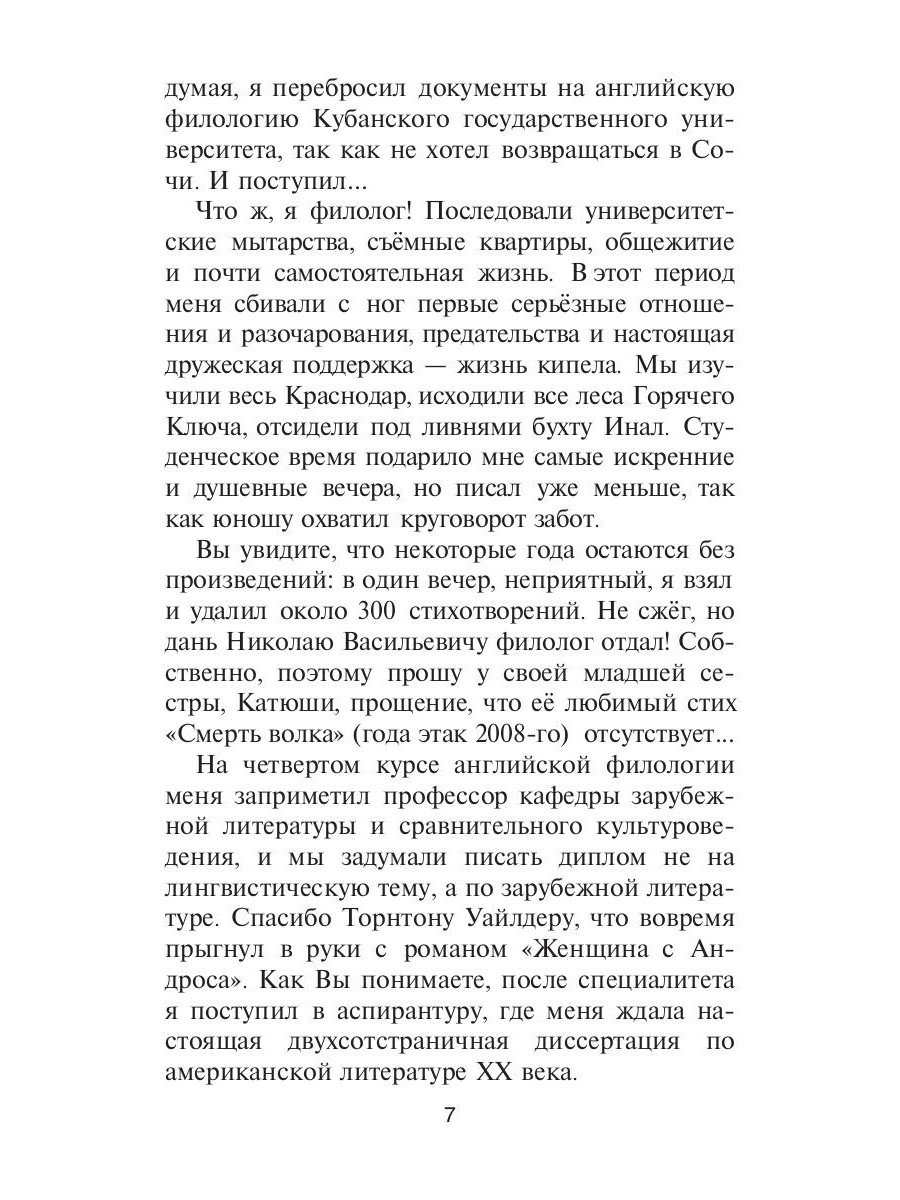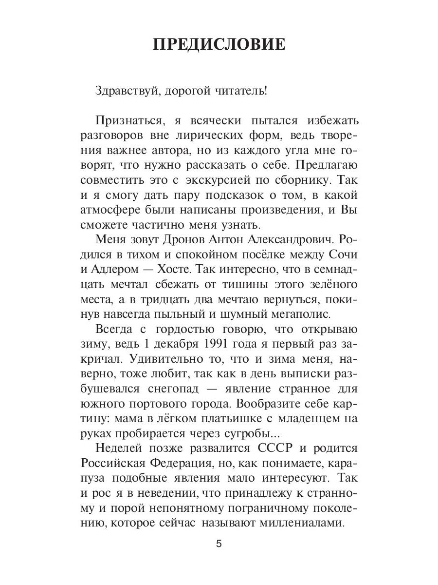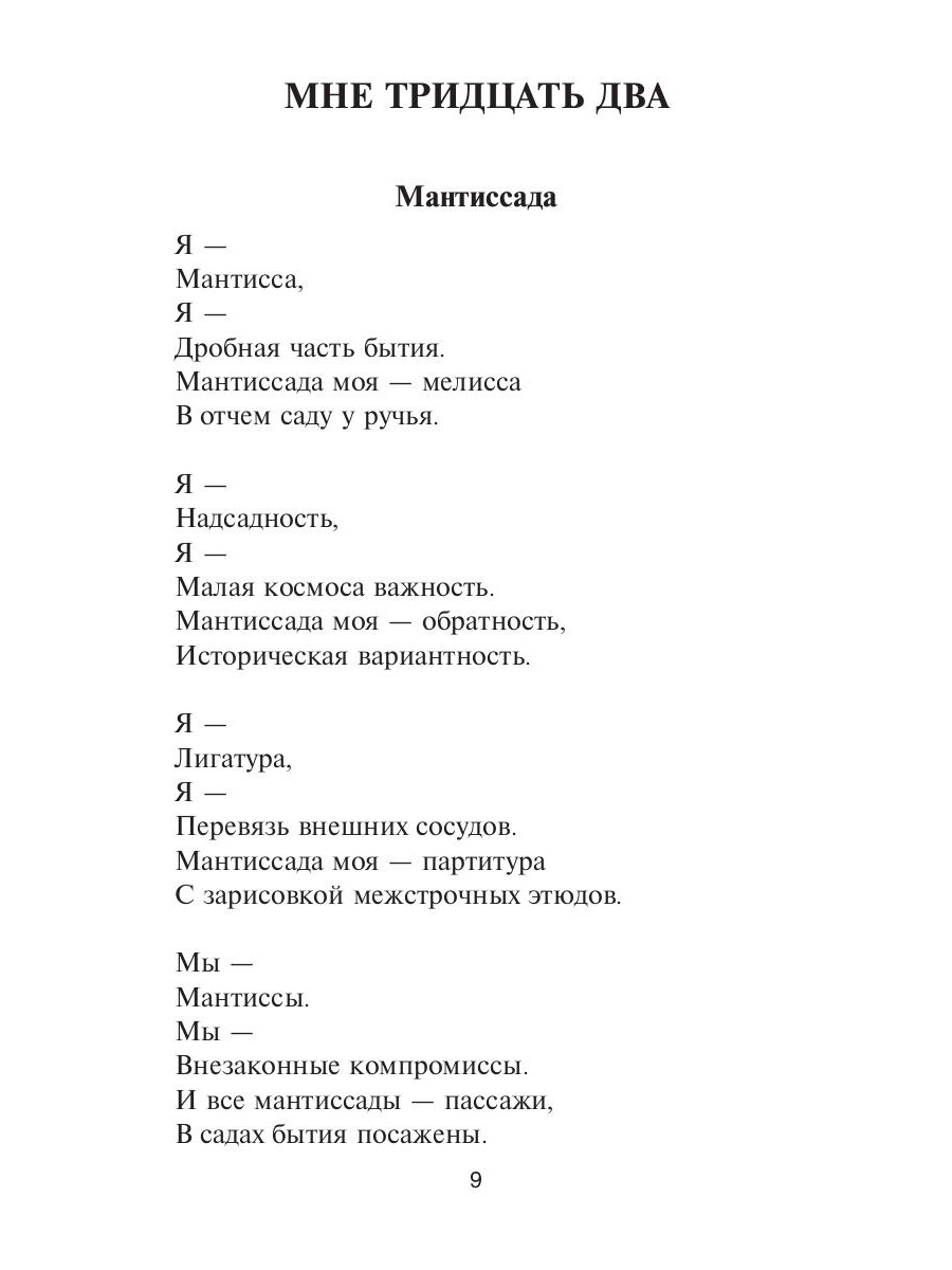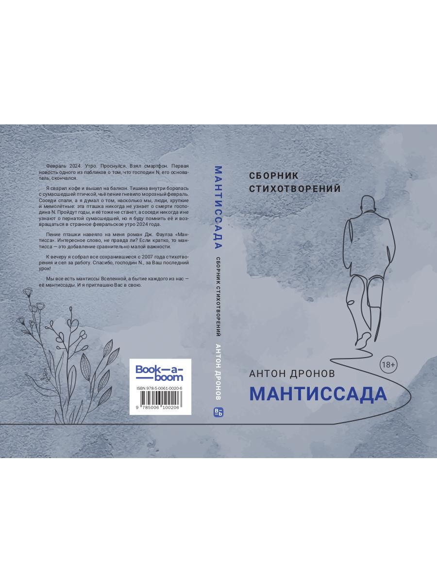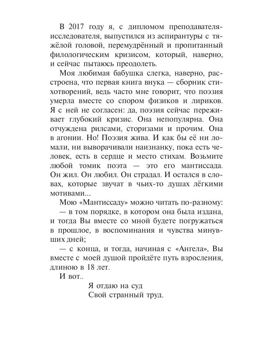 Февраль 2024. Утро. Проснулся, и первая новость в одном из пабликов о том, что господин N, его основатель, скончался. Я сварил кофе и вышел на балкон. Тишина внутри боролась с сумасшедшей птичкой, чьё пение гневило морозный февраль. Соседи спали, а я думал о том, насколько мы, люди, хрупкие и мимолётные: эта пташка никогда не узнает о смерти господина N. Пройдут годы, и её тоже не станет, и соседи никогда не узнают о пернатой сумасшедшей, но я буду помнить её пение и возвращаться в это февральское утро. Пташка мне напомнила роман Дж. Фаулза «Мантисса». Интересное слово, не правда ли? Если кратко, то мантисса - это добавление сравнительно малой важности. Осознавая смерть господина N, я вдруг подумал, что все мы мантиссы этой Вселенной… На следующий день я собрал все написанные с 2007 года стихотворения и сел за работу. Спасибо, господин N., за Ваш последний урок! Мы все есть мантиссы Вселенной, а бытие каждого из нас - её мантиссады. И я приглашаю Вас в свою.| Издательство | Т8 RUGRAM |
