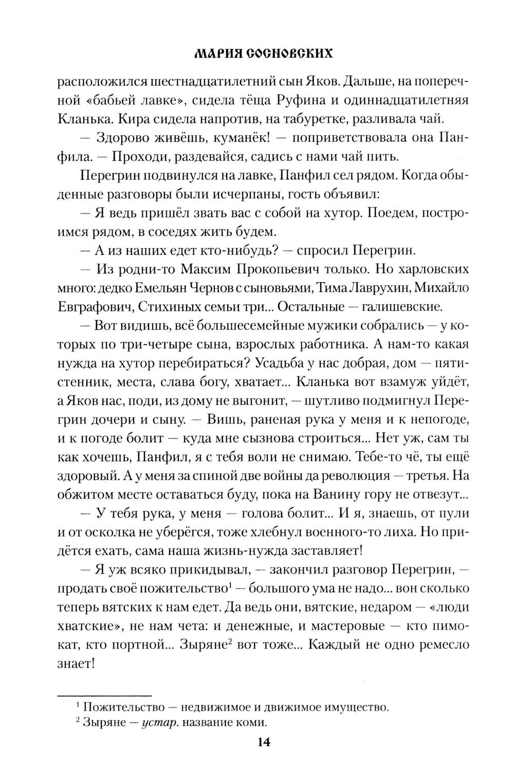 Заключительный роман эпической трилогии Марии Сосновских рассказывает о событиях первой половины ХХ века. Вместе с двумя предыдущими книгами, «Переселенцы» и «Чертята», трехтомник представляет собой уникальную энциклопедию быта, традиций, обычаев, истории, религиозных воззрений и трудовых навыков русского народа. На примере крестьянского рода Елпановых автор рисует картину истории России. Действие трилогии начинается в 1724 году, а заканчивается 9 мая 1945 года - в день окончания Великой Отечественной войны.| Издательство | Вече |