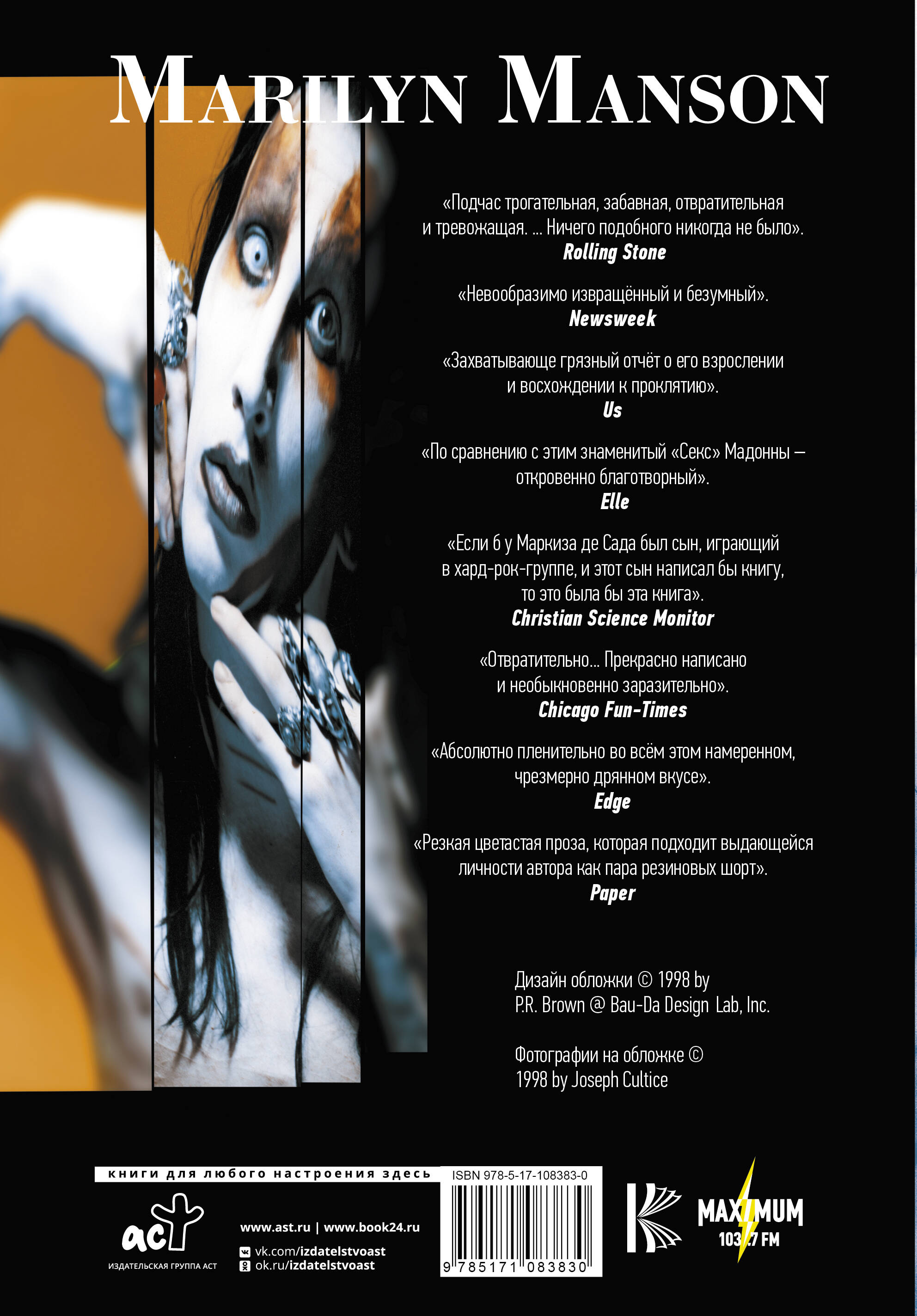 «Подчас трогательная, забавная, отвратительная и тревожащая. ...Ничего подобного никогда не было». - Rolling Stone «Невообразимо извращённый и безумный». - Newsweek «Захватывающе грязный отчёт о его взрослении и восхождении к проклятию». - Us «По сравнению с этим знаменитый «Секс» Мадонны - откровенно благотворный». - Elle «Если б у Маркиза де Сада был сын, играющий в хард-рок-группе, и этот сын написал бы книгу, то это была бы эта книга». - Christian Science Monitor «Отвратительно... Прекрасно написано и необыкновенно заразительно». - Chicago Fun-Times «Абсолютно пленительно во всём этом намеренном, чрезмерно дрянном вкусе». - Edge «Резкая цветастая проза, которая подходит выдающейся личности автора как пара резиновых шорт». - Paper| Издательство | ИЗДАТЕЛЬСТВО "АСТ" |