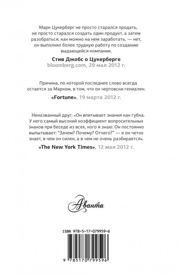 Книга посвящена Марку Цукербергу, который в свои 20 лет создал первую версию уникальной социальной платформы для общения Facebook, впоследствии получившей всемирную известность. Это собрание высказываний молодого миллиардера от первого лица (из различных интервью и выступлений), в которых он рассказывает о становлении компании Facebook, о ее структуре и принципах, о ее миссии, о своей роли в ее развитии и просто о себе.<br>В книгу также вошли высказывания родных и друзей Марка, людей большого бизнеса и просто коллег, дающие читателю взгляд со стороны на двадцатишестилетнего предпринимателя.| Автор/составитель | Джордж Бим |
