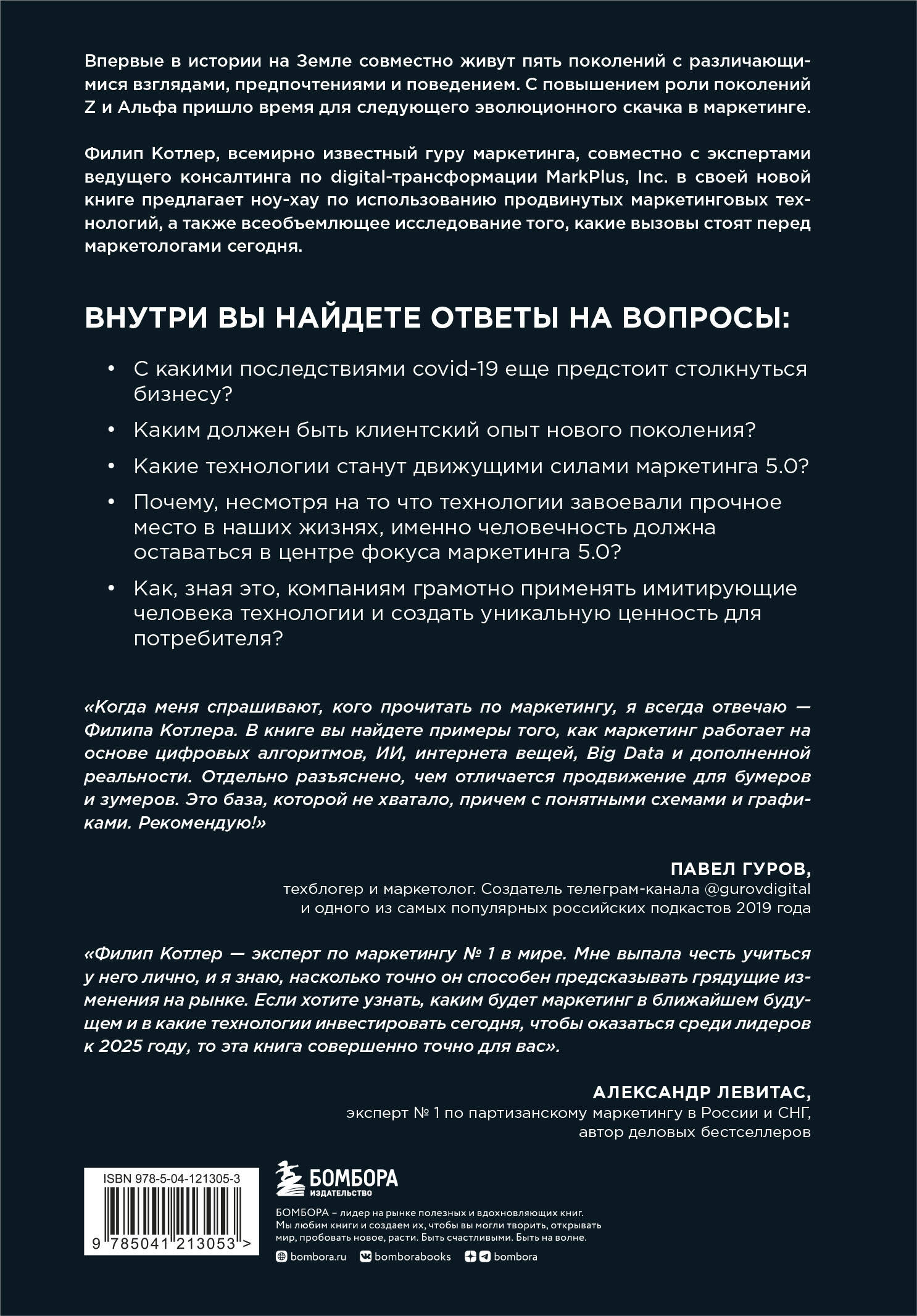 Впервые в истории на Земле совместно живут пять поколений с различающимися взглядами, предпочтениями и поведением. С повышением роли поколений Z и Альфа пришло время для следующего эволюционного скачка в маркетинге. Филип Котлер, всемирно известный гуру маркетинга, совместно с экспертами ведущего консалтинга по digital-трансформации MarkPlus, Inc. в своей новой книге предлагает ноу-хау по использованию продвинутых маркетинговых технологий, а также всеобъемлющее исследование того, какие вызовы стоят перед маркетологами сегодня. Внутри вы найдете ответы на вопросы: · С какими последствия COVID-19 еще предстоит столкнуться бизнесу? · Каким должен быть клиентский опыт нового поколения? · Какие технологии станут движущими силами маркетинга 5.0? · Почему, несмотря на то что технологии завоевали прочное место в наших жизнях, именно человечность должна оставаться в центре фокуса маркетинга 5.0.? · Как, зная это, компаниям грамотно применять имитирующие человека технологий и создать уникальную ценность для потребителя? «Когда меня спрашивают, кого прочитать по маркетингу, я всегда отвечаю - Филипа Котлера. В книге вы найдете примеры того, как маркетинг работает на основе цифровых алгоритмов, ИИ, интернета вещей, Big Data и дополненной реальности. Отдельно разъяснено, чем отличается продвижение для бумеров и зумеров. Это база, которой не хватало, - причем с понятными схемами и графиками. Рекомендую!» - Павел Гуров, техблогер и маркетолог. Создатель телеграм-канала @gurovdigital и одного из самых популярных российских подкастов 2019 года «Филип Котлер - эксперт по маркетингу № 1 в мире. Мне выпала честь учиться у него лично, и я знаю, насколько точно он способен предсказывать грядущие изменения на рынке. Если хотите узнать, каким будет маркетинг в ближайшем будущем и в какие технологии инвестировать сегодня, чтобы оказаться среди лидеров к 2025 году, то эта книга совершенно точно для вас». - Александр Левитас, эксперт № 1 по партизанскому маркетингу в России и СНГ, автор деловых бестселлеров| Издательство | ООО "Издательство "Эксмо" |