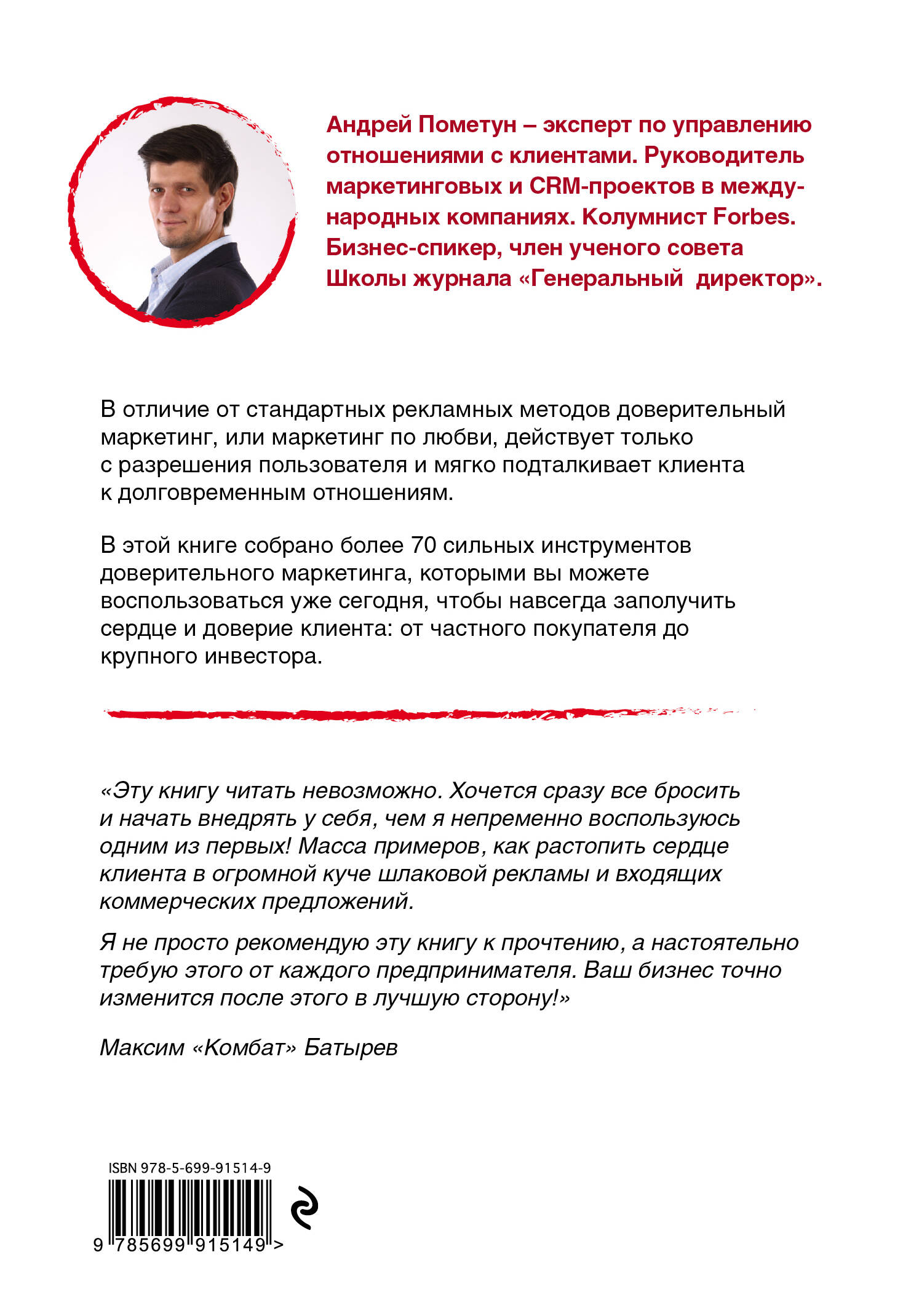 "Эту книгу читать невозможно. Хочется сразу все бросить и начать внедрять у себя, чем я непременно воспользуюсь одним из первых! Масса примеров, как растопить сердце клиента в огромной куче шлаковой рекламы и входящих коммерческих предложений. Я не просто рекомендую эту книгу к прочтению, а настоятельно требую этого от каждого предпринимателя. Ваш бизнес точно изменится после этого в лучшую сторону!".