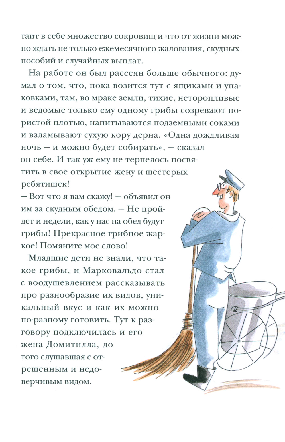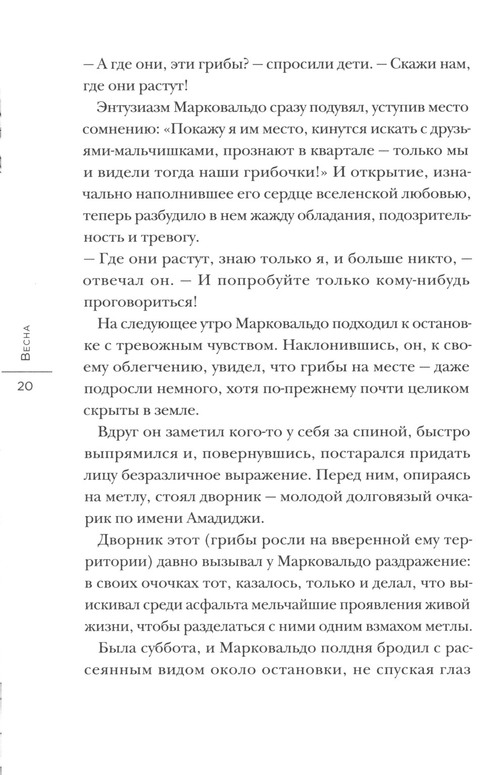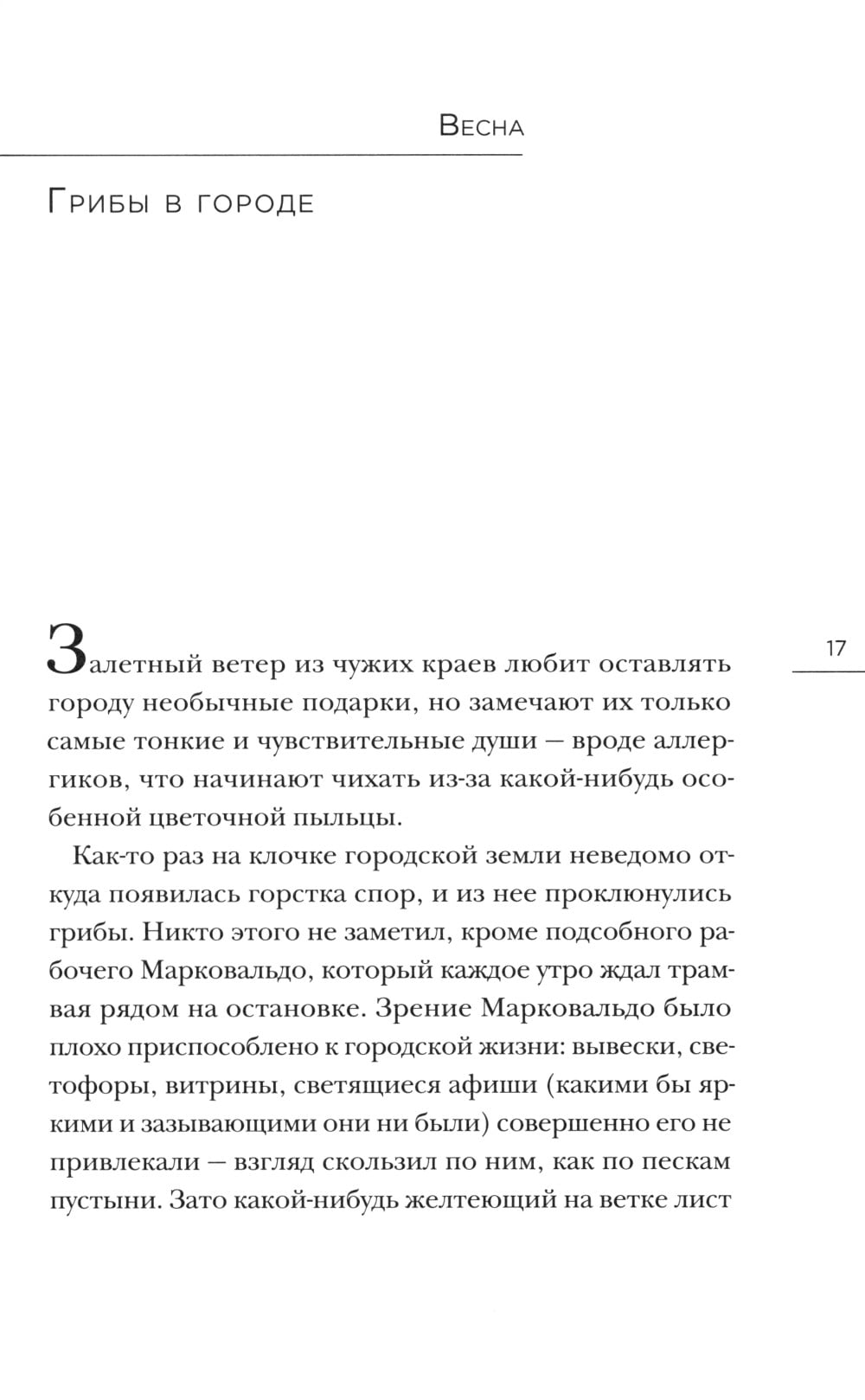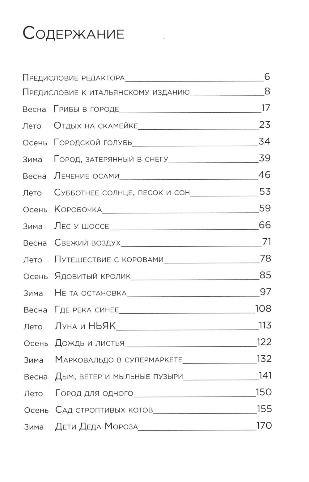 Это книга о приключениях итальянского рабочего по имени Марковальдо. Он очень любит деревню, но вынужден жить в большом городе. Среди заводов и бетона Марковальдо пытается отыскать живую природу, но все время попадает впросак: выросшие на автобусной остановке грибы оказываются ядовитыми, синева реки объясняется отходами с завода красок, а деревья у шоссе оборачиваются рекламными щитами. Однако Марковальдо не унывает и продолжает внимательно всматриваться в окружающий мир - к нашему читательскому удовольствию.| Издательство | Белая ворона/ALBUS CORVUS |