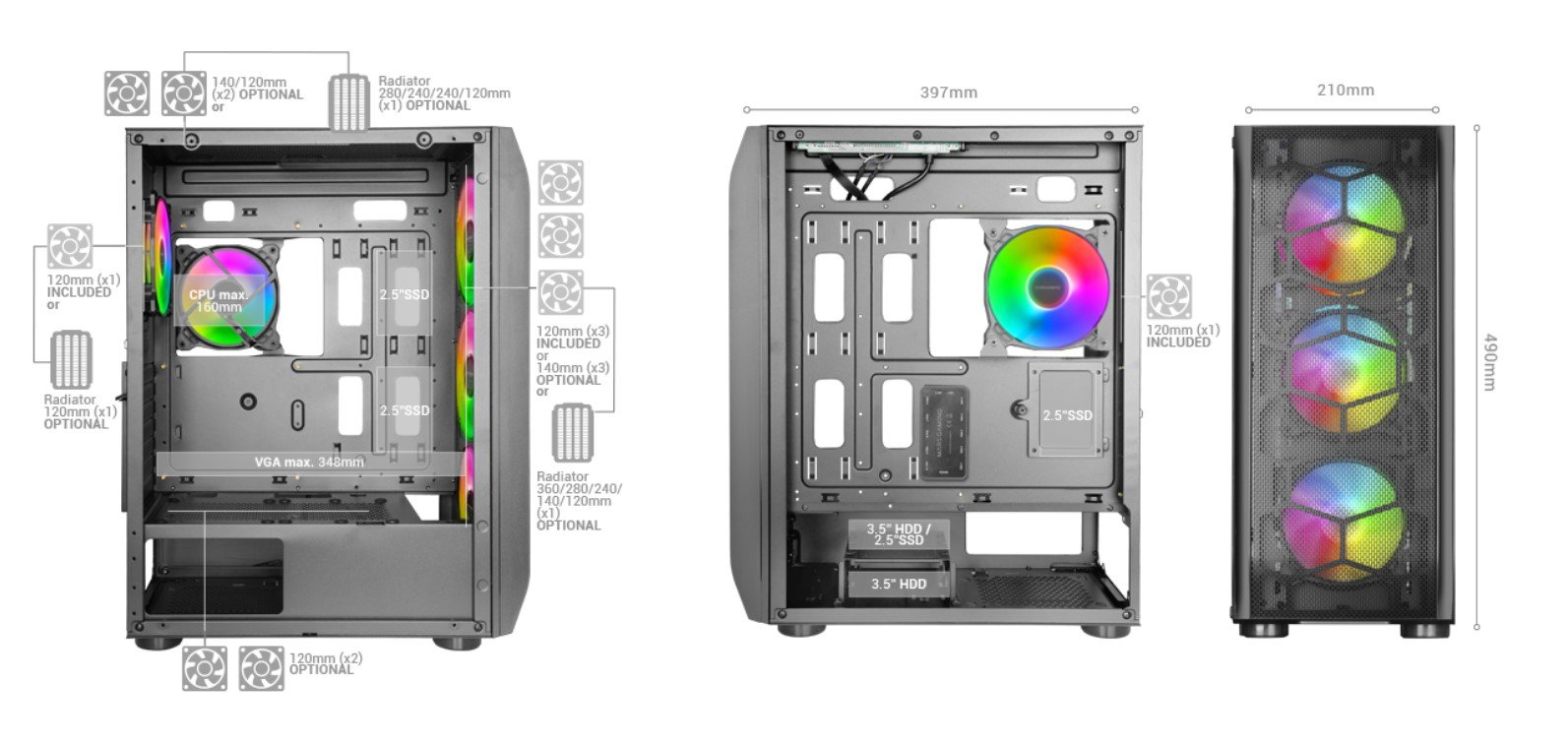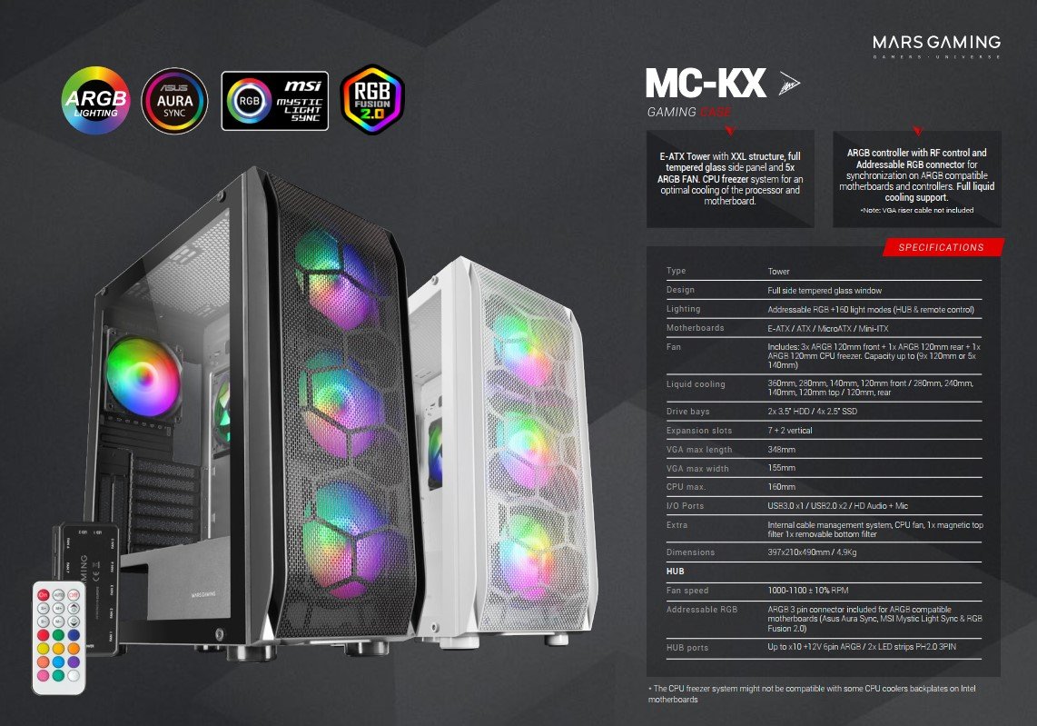 MARS GAMING MC-KX- это игровой корпус для энтузиастов и топовых игровых конфигураций. Имеет боковое окно и 5x АRGB вентилятора в комплекте, управляемыми умным HUB от MARS GAMING.