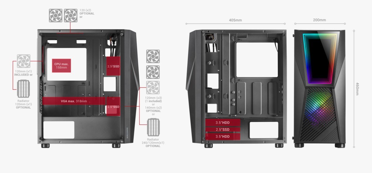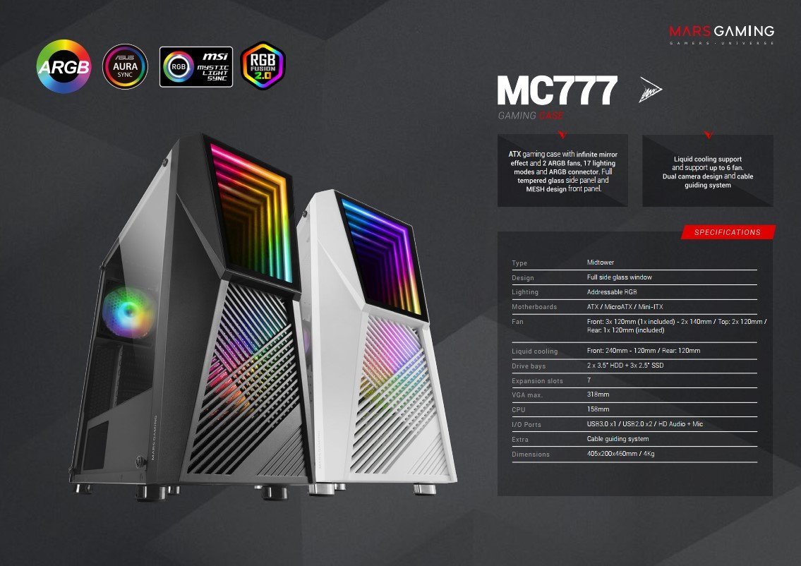 MARS GAMING MC777- это игровой корпус для средних и топовых игровых конфигураций. Имеет боковое окно и 2x АRGB вентилятора в комплекте. Пердняя панель выполнена в стиле "Infinity Mirror" с управляемой ARGB подсветкой совместимой с Asus Aura Sync, MSI Mystic Light Sync и RGB Fusion 2.0.