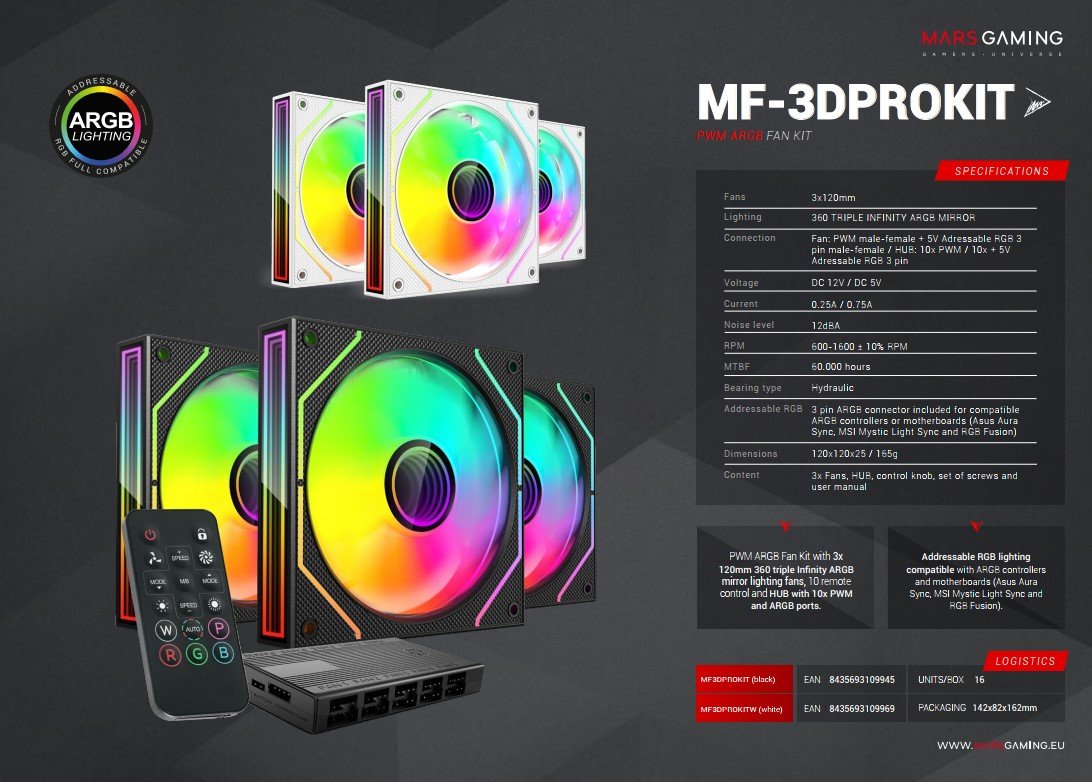 Mars Gaming MF3DPROKITW ARGB 120mm Комплект кулеров для компьютера с дистанционным управлением