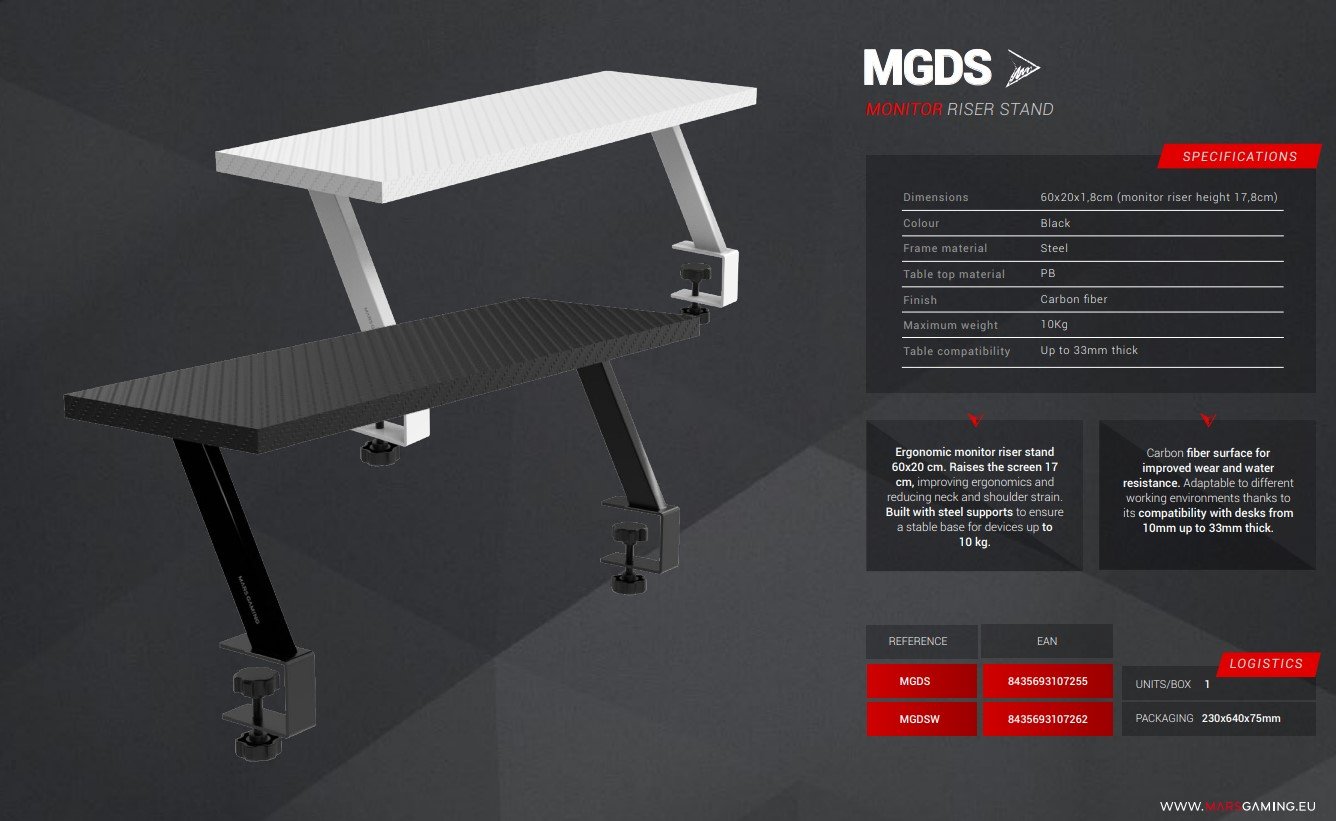 Выровняйте свое рабочее пространство с помощью подставки для монитора MGDS, разработанной для поддержания более здоровой осанки и повышения ежедневного комфорта. Поднимая монитор на 17 см, вы можете выровнять экран на идеальной эргономичной высоте, снижая нагрузку на шею и плечи. Благодаря верхней поверхности из углеродного волокна размером 60x20 см и прочной стальной раме эта подставка обеспечивает прочность и пространство, необходимые для размещения любого монитора или устройства на вашем столе. Кроме того, она обеспечивает быструю и надежную установку с помощью регулируемых зажимов, совместимых со столами толщиной от 10 до 33 мм.