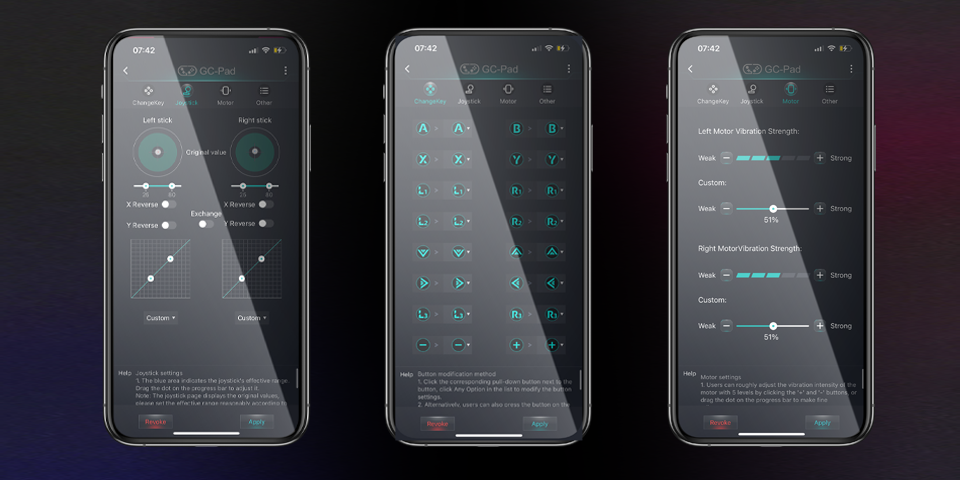 - Приложение управления Android/ios (Полное управление настройкой вашего MGP-BT благодаря его управляющему ПРИЛОЖЕНИЮ на Android и IOS. Переназначьте кнопки, идеально отрегулируйте чувствительность джойстиков, выберите характеристики двойной тактильной системы вибрации, отрегулируйте автоматический время выключения, и проведите эксплуатационные тесты джойстиков и кнопок)