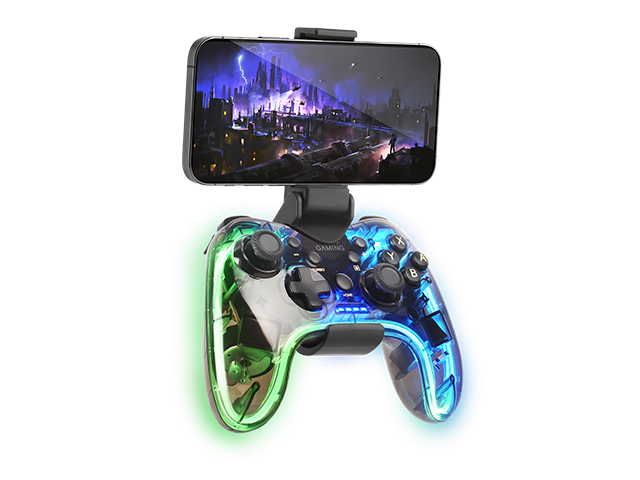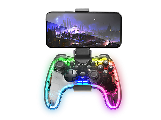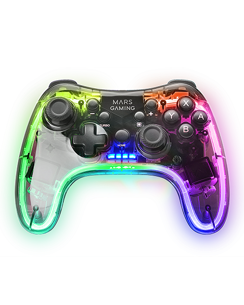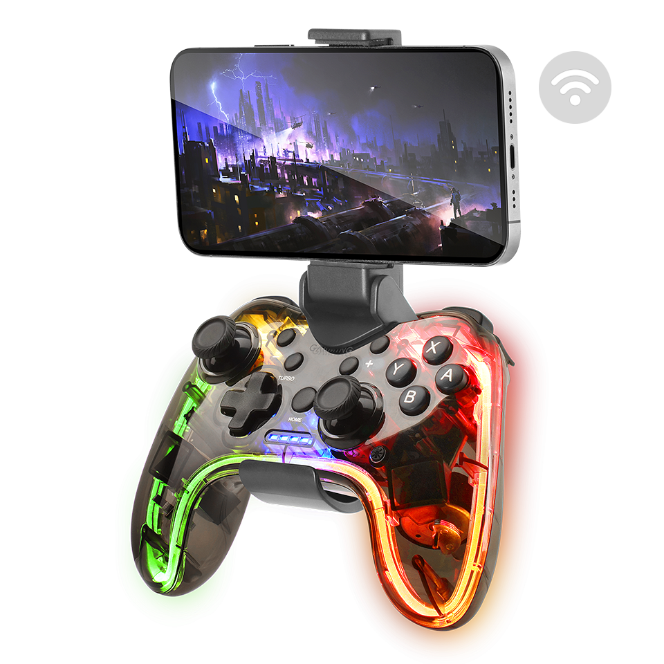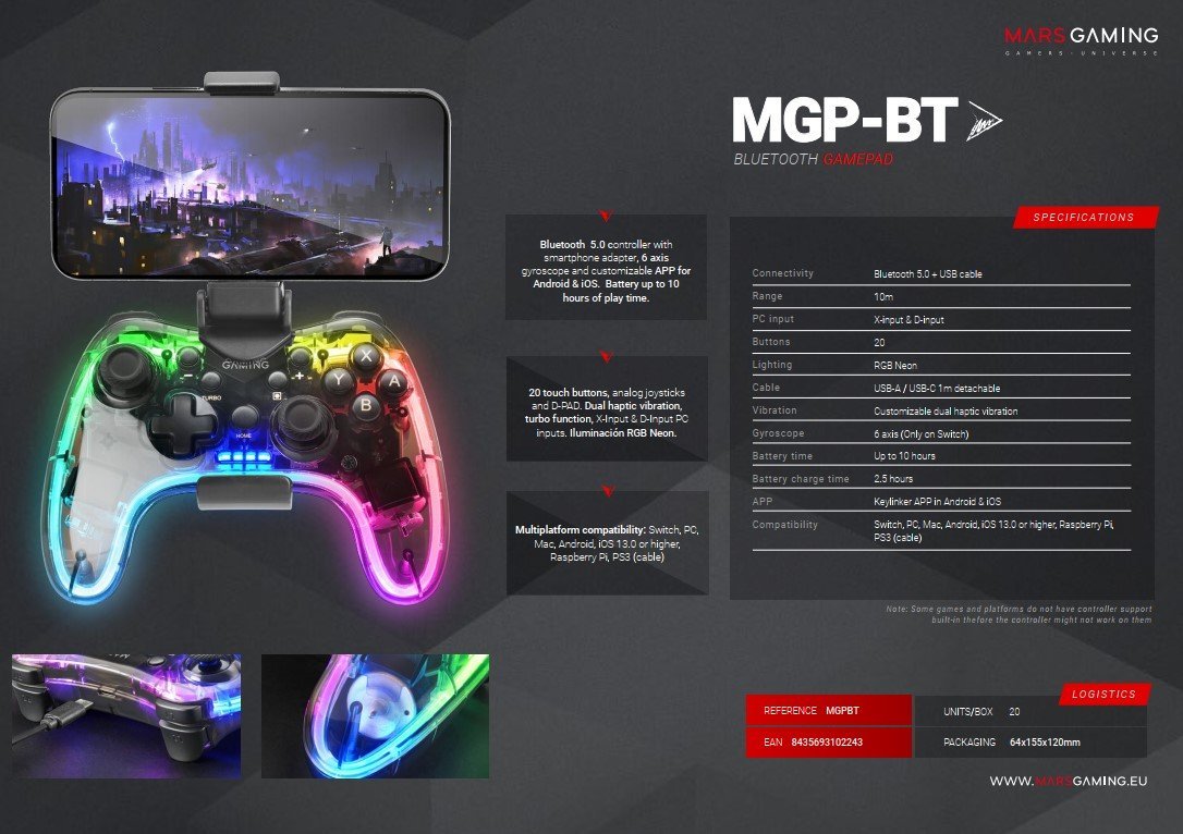 Mars Gaming MGP-BT Беспроводной геймпад с двойным подключением Bluetooth 5.0 и USB. Усовершенствованная гироскопическая система и двойная тактильная вибрация. Впечатляющий черный полупрозрачный дизайн с подсветкой NEON RGB. Приложение для управления Android/IOS. Адаптер для смартфона и кроссплатформенная совместимость.