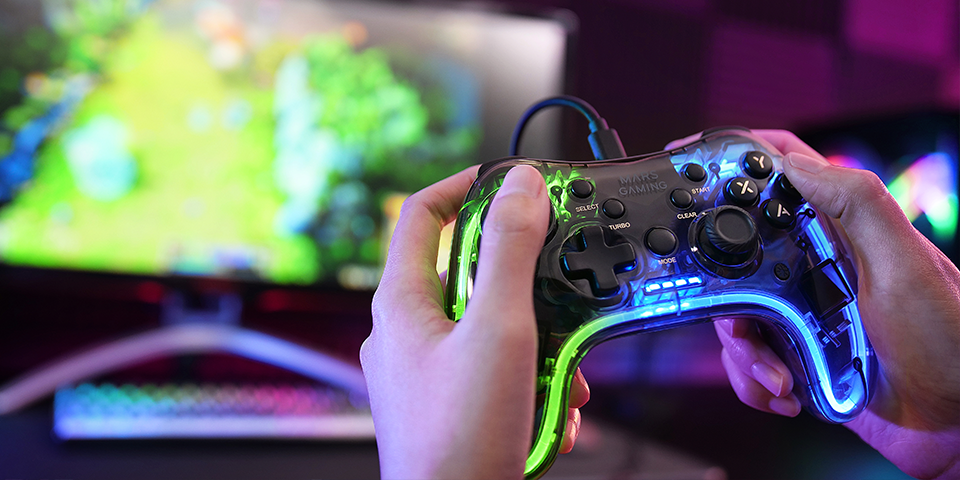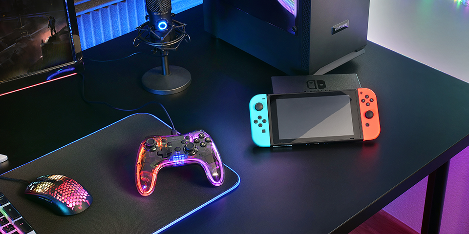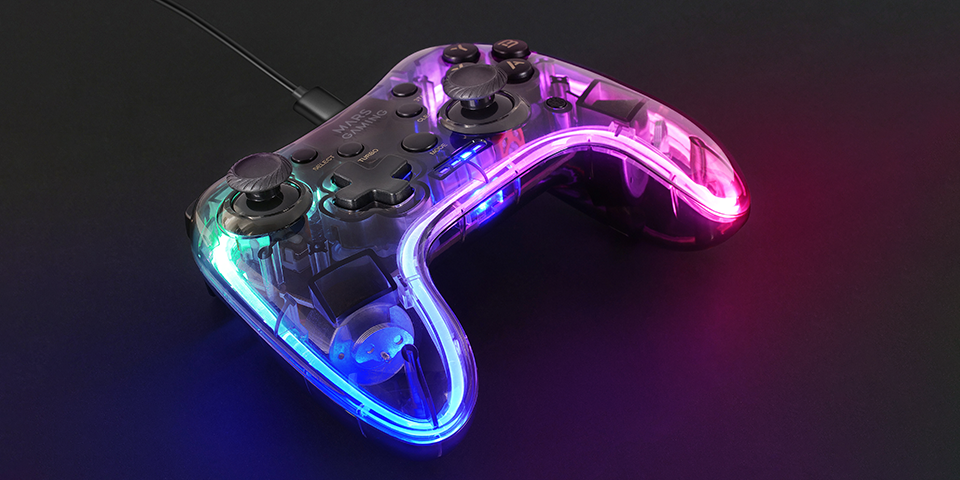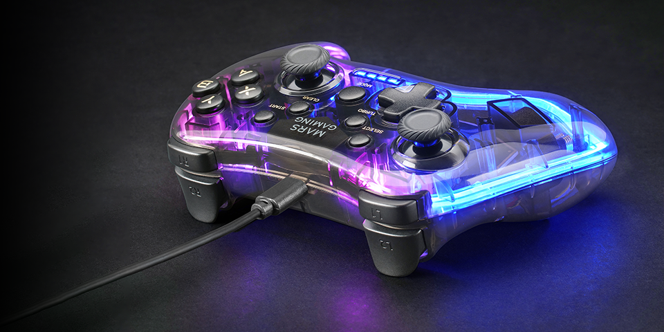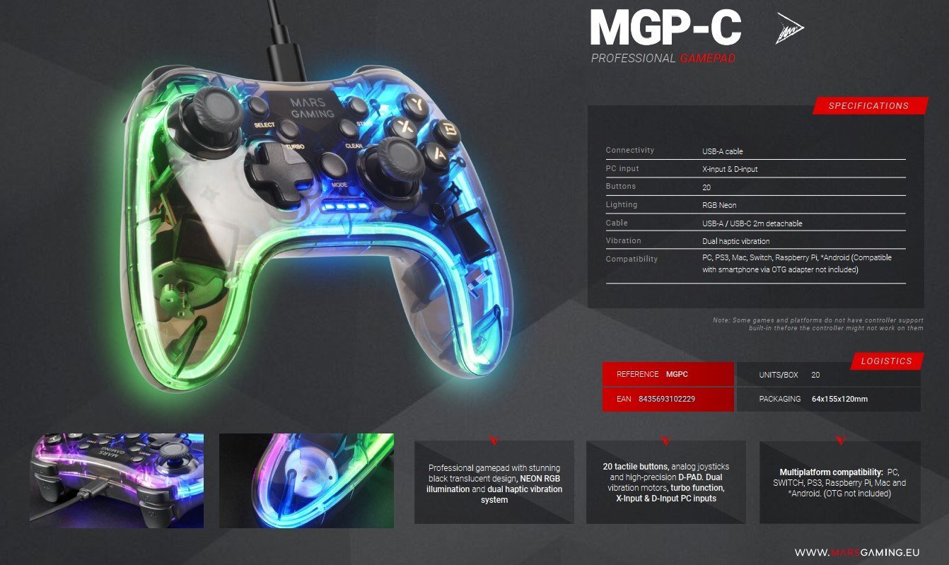 Mars Gaming MGP-C Профессиональный игровой контроллер с потрясающим черным прозрачным дизайном и подсветкой NEON RGB. Двойная система вибрации, съемный кабель USB-A/USB-C и отличная кроссплатформенная совместимость.
