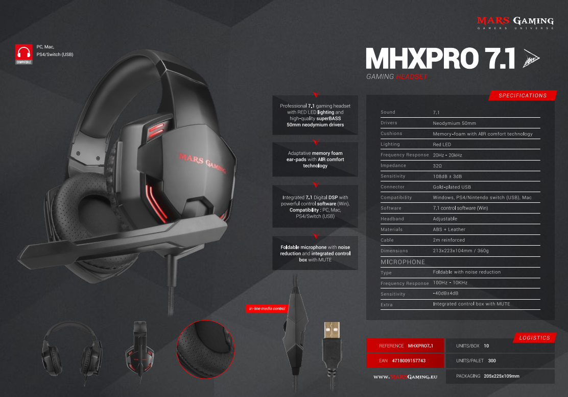 MHX PRO 7.1 предлагает великолепное качество звука, сочетая в себе высочайший комфорт с системой позиционирования 7.1, и все это усиливается классической красной LED подсветкой.