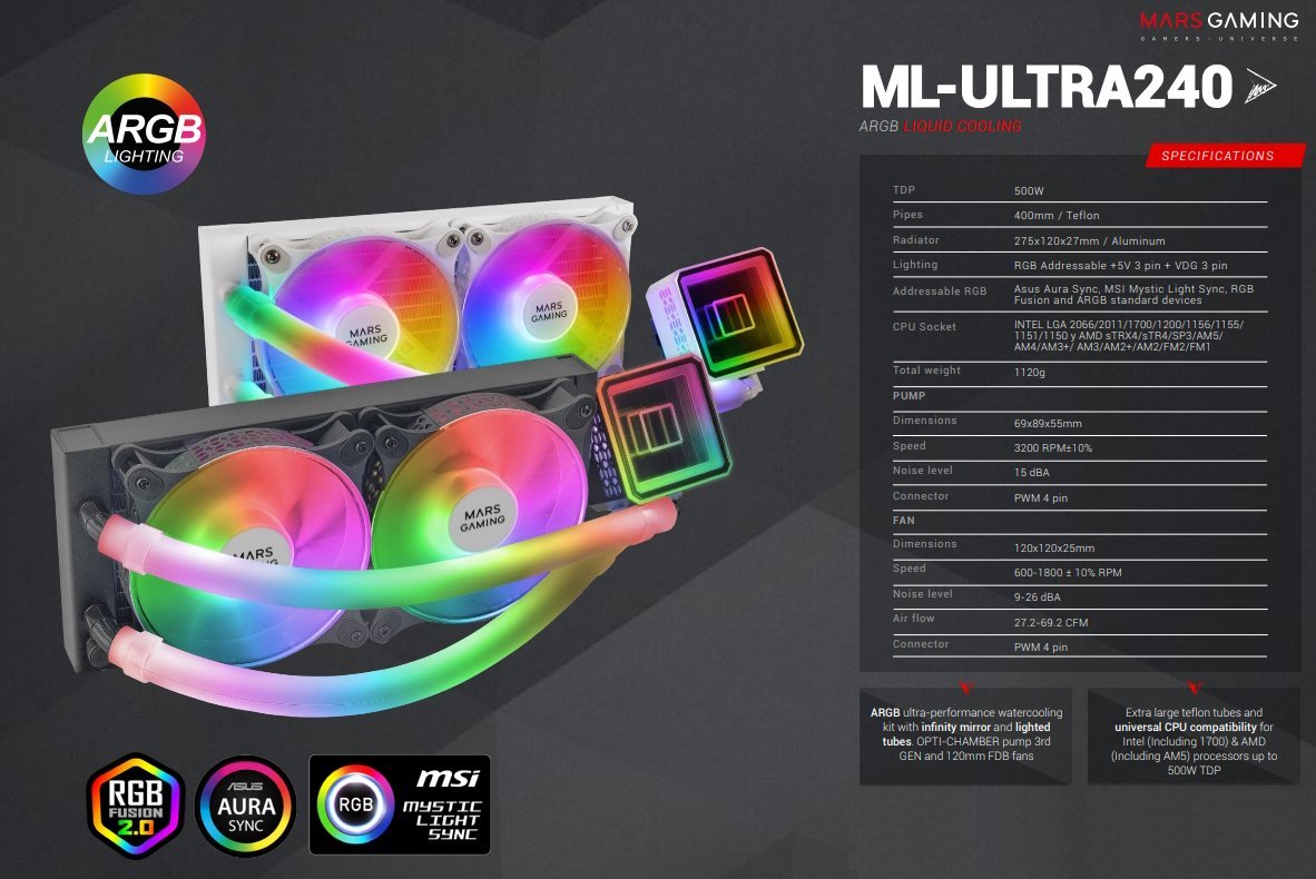 Система жидкостного охлаждения процессора Mars Gaming ML-ULTRA240 ARGB с двумя 120-мм вентиляторами FDB ARGB и трубками ARGB