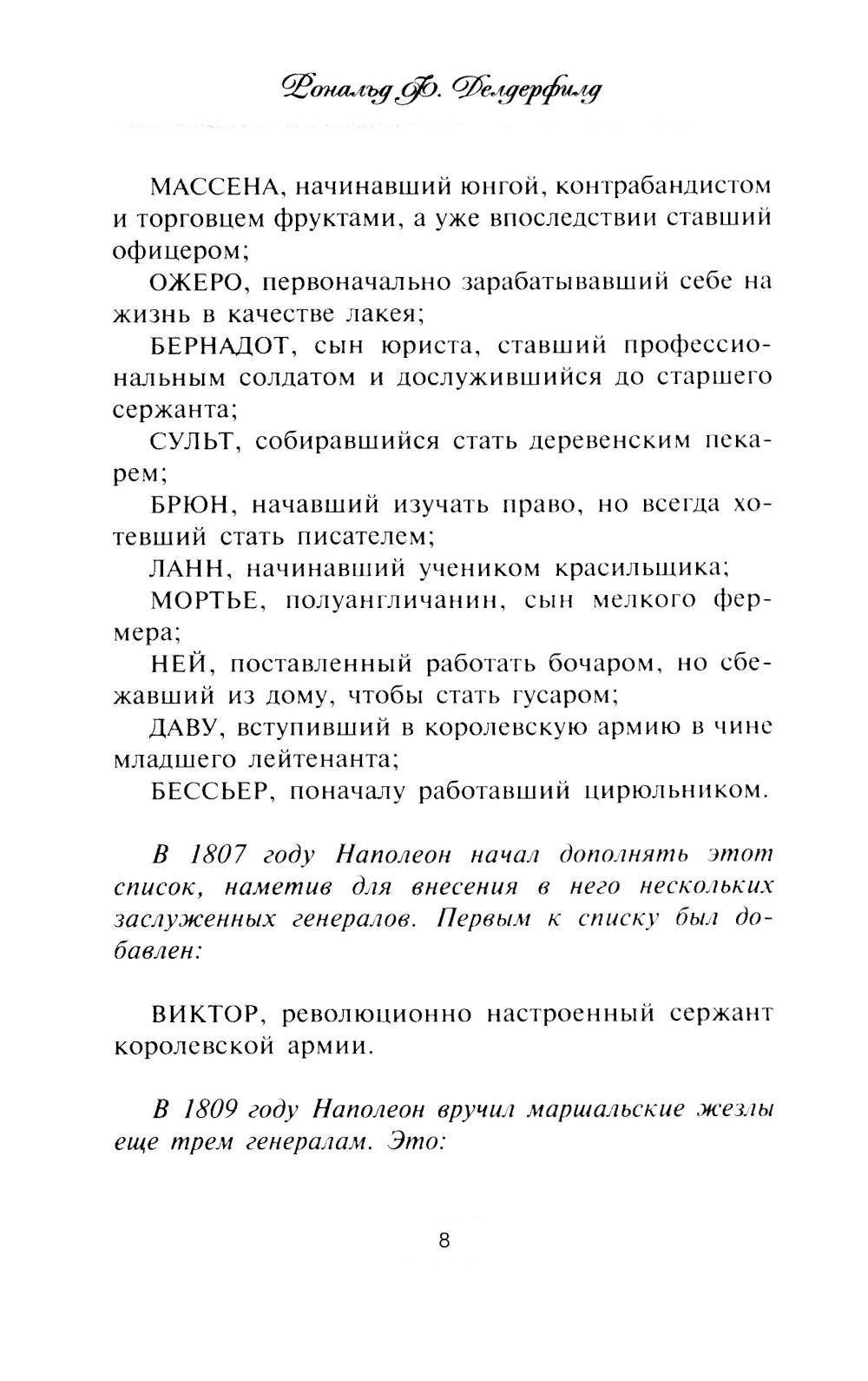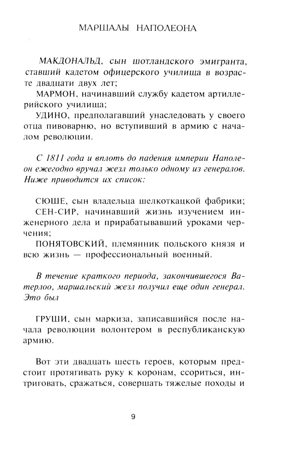 В книге рассказывается о жизни двадцати шести знаменитых полководцев, которые получили свой маршальский жезл от Наполеона. Это были люди самого разного происхождения: от аристократов до выходцев из низших слоев общества. Читатель узнает, с чего начинали эти храбрые и честолюбивые люди, как относились к власти, с чем пришли к концу жизни и как вели себя по отношению к человеку, которому были обязаны своим высоким положением. Книга поможет понять влияние Наполеона на людей его поколения и на политическую ситуацию в Европе.