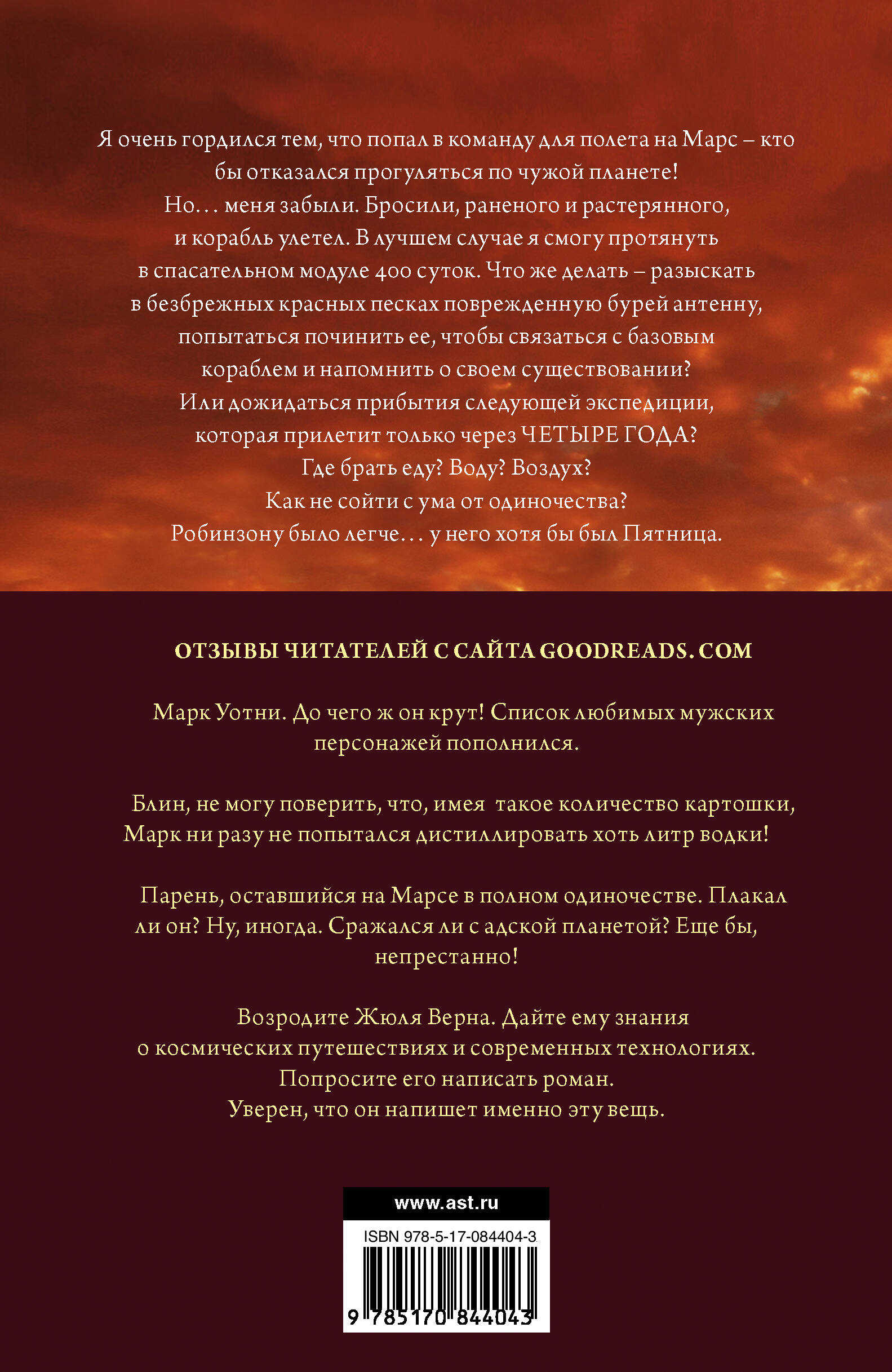 Я очень гордился тем, что попал в команду для полета на Марс - кто бы отказался прогуляться по чужой планете! Но… меня забыли. Бросили, раненого и растерянного, и корабль улетел. В лучшем случае я смогу протянуть в спасательном модуле 400 суток. Что же делать - разыскать в безбрежных красных песках поврежденную бурей антенну, попытаться починить ее, чтобы связаться с базовым кораблем и напомнить о своем существовании? Или дожидаться прибытия следующей экспедиции, которая прилетит только через ЧЕТЫРЕ ГОДА? Где брать еду? Воду? Воздух? Как не сойти с ума от одиночества? Робинзону было легче… у него хотя бы был Пятница.| Издательство | ИЗДАТЕЛЬСТВО "АСТ" |