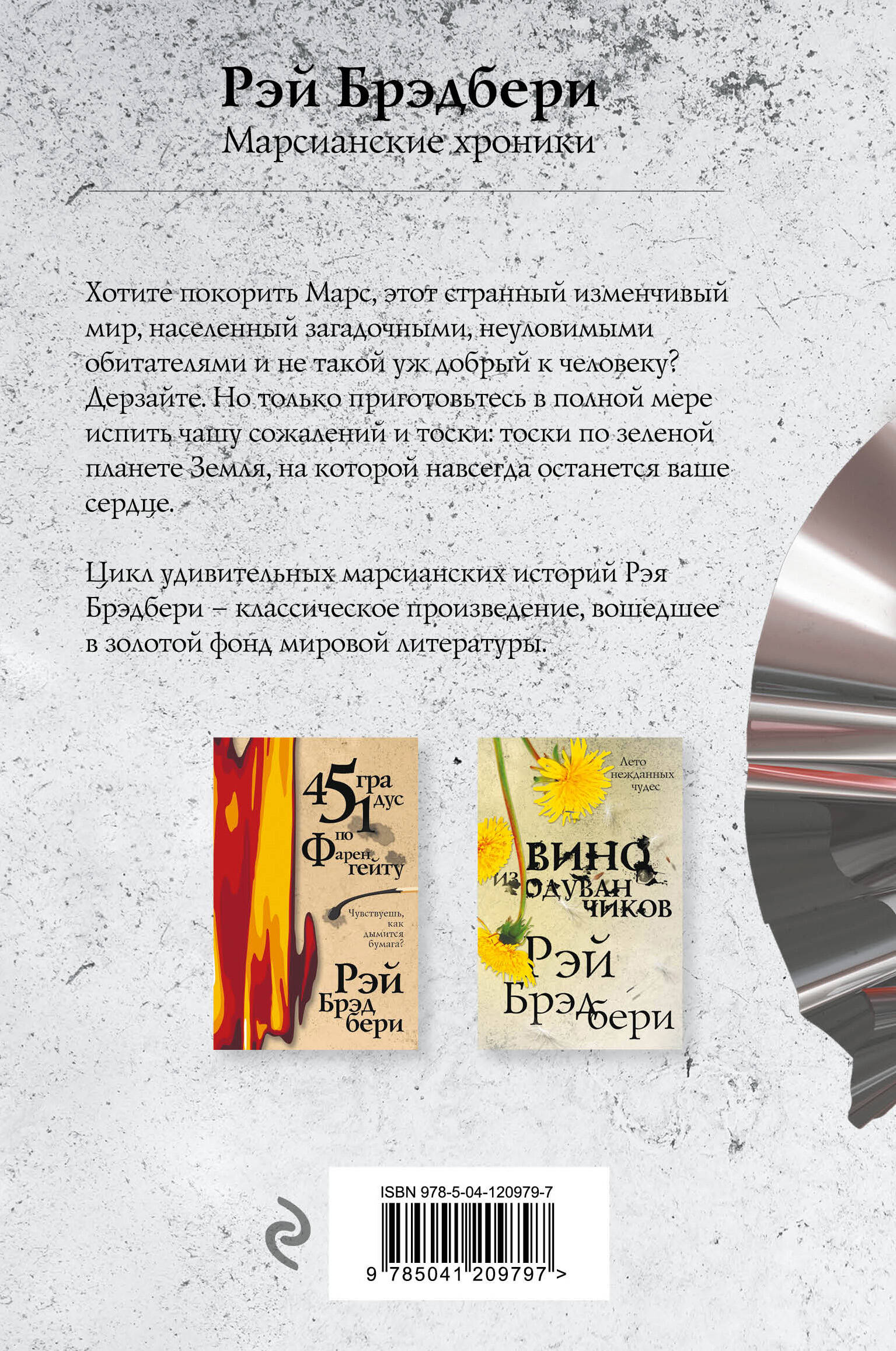 Хотите покорить Марс, этот странный изменчивый мир, населенный загадочными, неуловимыми обитателями и не такой уж добрый к человеку? Дерзайте. Но только приготовьтесь в полной мере испить чашу сожалений и тоски: тоски по зеленой планете Земля, на которой навсегда останется ваше сердце. Цикл удивительных марсианских историй Рэя Брэдбери - классическое произведение, вошедшее в золотой фонд мировой литературы. Легендарный роман в новеллах классика мировой литературы Рэя Брэдбери. Десятки переизданий и миллионы поклонников по всему миру. Философское переосмысление вечной темы покорения человеком других планет. Один из лучших романов Грандмастера Научной Фантастики. Стильное оформление для молодой аудитории.| Издательство | ООО "Издательство "Эксмо" |