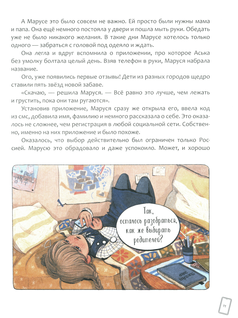 Книга «Маруся меняет родителей» серии «Книжный клуб. Сам почитаю!» - волшебная повесть о том, как ребенок на собственном опыте познает, что же лучше для него и почему. Эта удивительная история приключилась с обычной девочкой Марусей. У нее есть любимая подруга Аська, веселый папа и вечно занятая мама. Но в последнее время родители постоянно ругаются, их ссоры заставляют Марусю страдать. Неожиданно оказывается, что в новом приложении на телефоне можно поменять родителей, и Маруся решается на отчаянный шаг. Какие же родители лучше - свои или идеальные?| Издательство | Мозаика-Синтез |