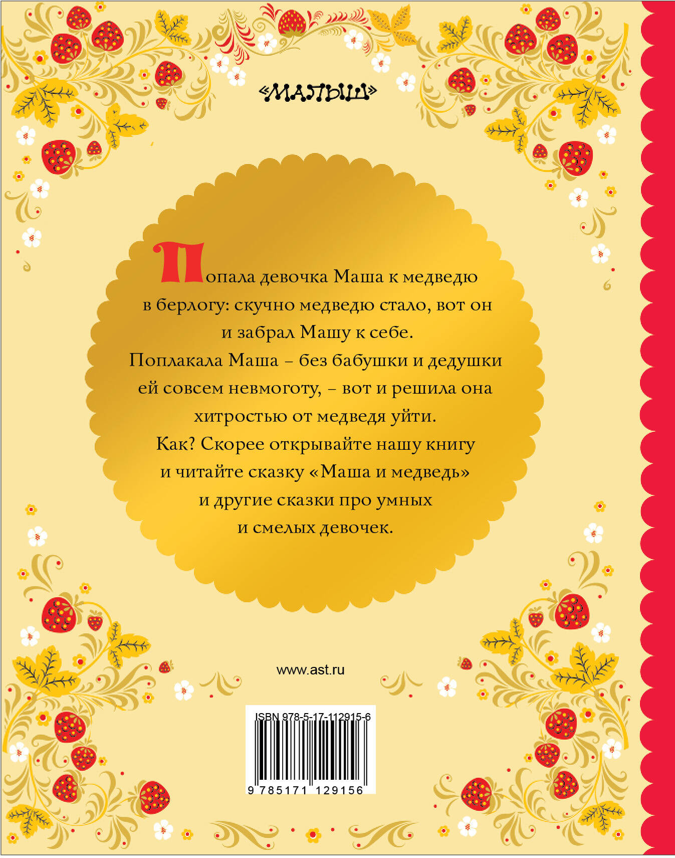 Попала девочка Маша к медведю в берлогу: скучно медведю стало, вот он и забрал Машу к себе. Поплакала Маша - без бабушки и дедушки ей совсем невмоготу, - да и решила хитростью от медведя уйти. Как? Скорее открывайте нашу книгу и читайте сказку «Маша и медведь» и другие сказки про умных и смелых девочек.| Издательство | ИЗДАТЕЛЬСТВО "АСТ" |