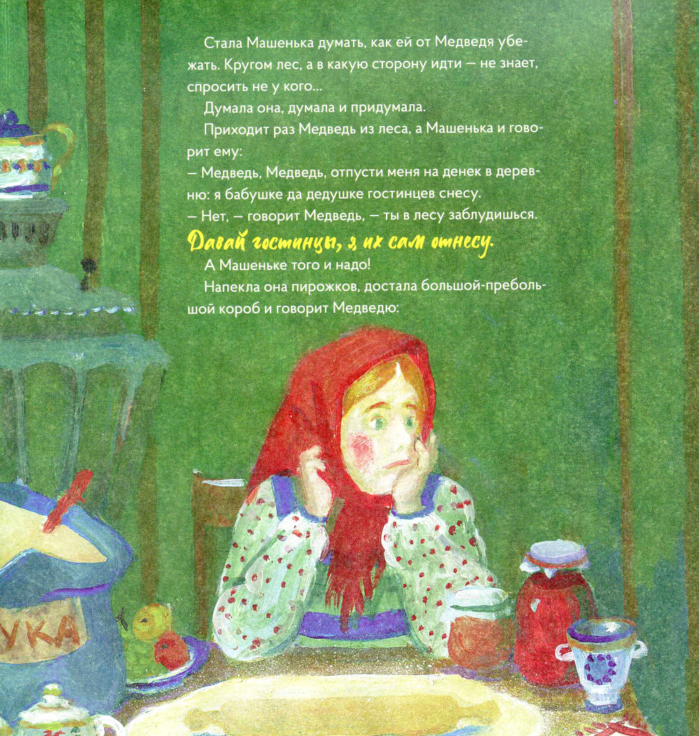 Русская народная сказка об умной девочке Маше. Как-то раз она пошла по ягоды с подружками и потерялась в чаще. В лесу Маша наткнулась на избушку, а жил в ней Медведь. Стала и Маша там жить, но тосковала она по дому и придумала хитрый план, как вернуться к семье! Знакомую с детства сказку сопровождают иллюстрации в стиле Бориса Кустодиева - художника, который писал Россию пышно, жизнерадостно, ярко! Сравнивайте картинки из книги с оригиналами работ великого мастера, ищите общие детали и улавливайте различия.| Издательство | VoiceBook |