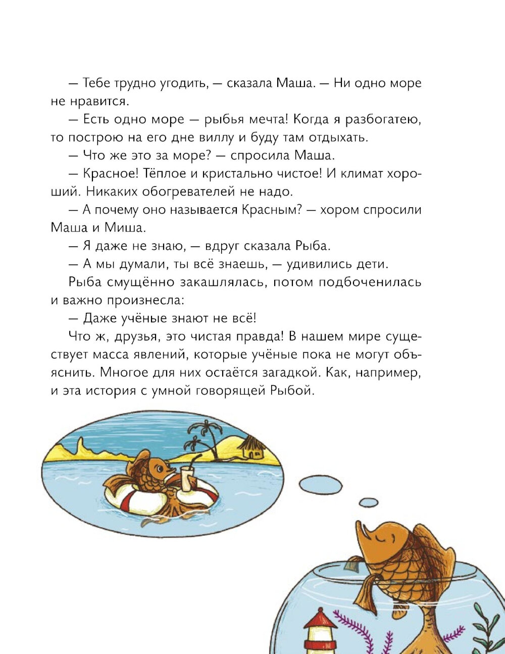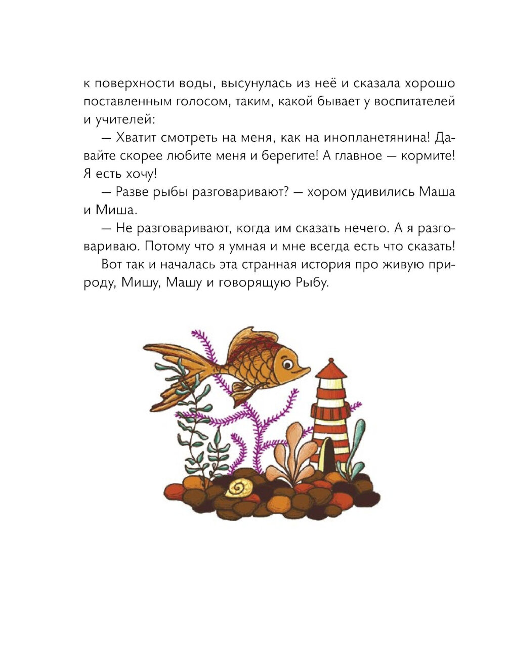 Оказывается, говорящие рыбы встречаются не только в сказках или в синем море. Иногда они могут обитать в самом обычном домашнем аквариуме. Рыба, поселившаяся у близнецов Маши и Миши, умна, образована и прекрасно разбирается в географии, экологии и различных явлениях природы. Не просто рыба, а настоящая плавающая энциклопедия! Умная, но своенравная: если что не по ней, может и плавником «топнуть». Тем не менее, эта рыба стала отличной наставницей для ребят, подготовила их к школе лучше любого репетитора. Но главное, чему она научила близнецов, это мыслить э-ко-ло-ги-чес-ки! Что это значит? Откройте книгу, и Ирина Мошаева в своей увлекательной сказке расскажет вам, как важно заботиться об окружающем мире. Эта книга от издательства Абраказябра предназначена для чтения детьми под руководством взрослых и поможет юным читателям лучше понять мир экологии и эко-образование.| Издательство | Абраказябра |