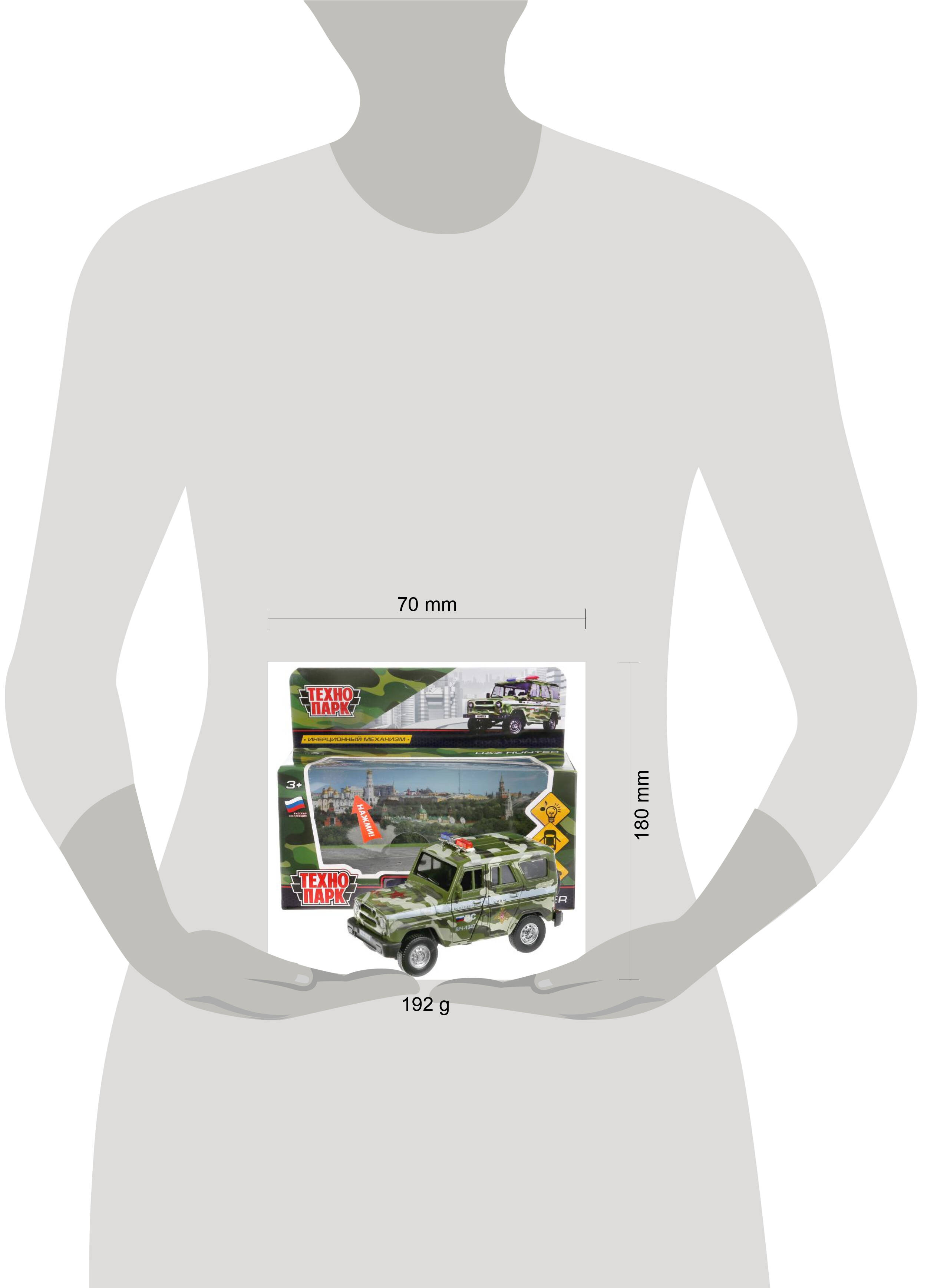 Машина металл свет-звук UAZ HUNTER ВОЕННЫЙ 12 см, двери, багаж, в кор. Технопарк в кор.2*36шт