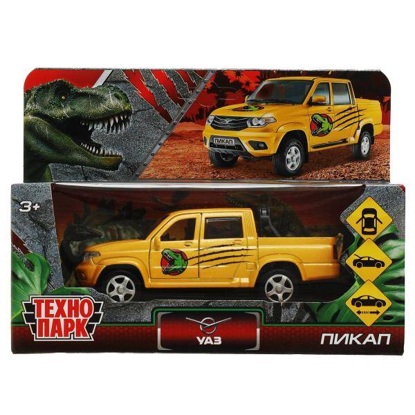Машина металл УАЗ ПИКАП ДИНОЗАВРЫ 12 см, двери, багаж, инерц, желтый, кор. Технопарк в кор.2*36шт