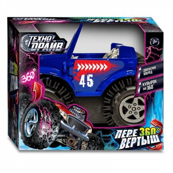 Машина-перевёртыш ТМ "Технодрайв" станет отличным подарком для вашего ребёнка: - 4 больших колеса - движение вперёд - кувырок на 360 градусов Яркая машина-перевёртыш непременно понравится юному автолюбителю. Рельефные колёса гарантируют крепкое сцепление с поверхностью и предохраняют от "аварий" во время быстрой езды. Игра с машинкой-перевёртышем ТМ "Играем вместе" знакомит с моделями автомобилей и тренирует: - координацию движений - внимание - ловкость Размер: 10 х 8 х 8 см. Материал: пластмасса + металл. Работает от 2-х батареек типа АА (не входят в комплект). Рекомендовано детям старше 3-х лет.